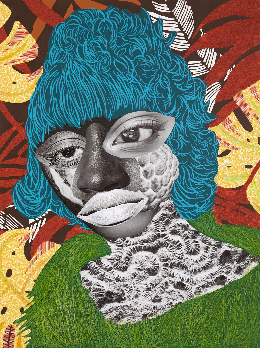 Cydne Jasmin Coleby draws inspiration from old family photographs and memories of the past. But also from her own face. Through her self-portraits, she blends textures and patterns, creating compositions that reflect both her duality and multiplicity, much like collages.