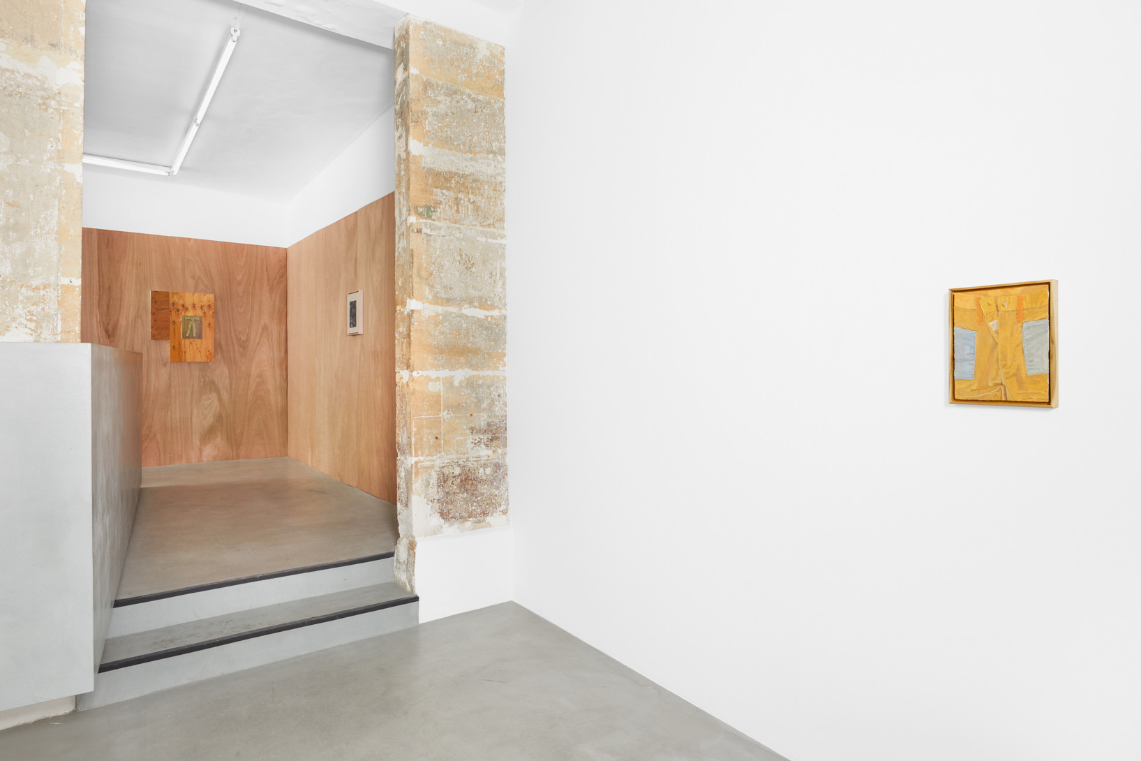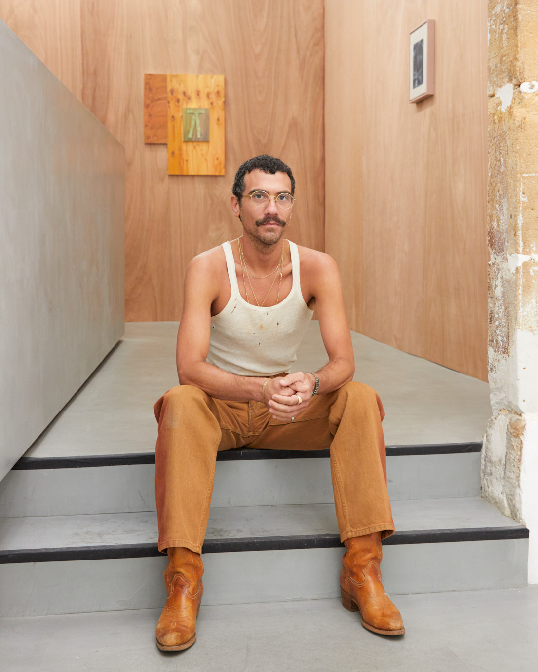 Traces of landscape appear throughout, charging the canvases with a keen sense of time and place. Red dirt, for example, unique to Oklahoma’s iron-rich soil, is collected from Lombardo’s visits back to his birth state, providing not just a formal texture to the canvas but also a gesture to home that materially provides an autobiographical layer to the works. Light is also utilized as formative material in Lombardo’s tableaux, foregrounding the sheen of a signature cufflinks, the glisten of its satin bow tie, and collected weathered western wear. Lombardo distorts the imagery and the perspectives of the classic objects sourced from his personal collections and experiences, allowing him to transform recognizable mise-en-scènes into vivid explorations that celebrate the quiet moments of cherished regional memory and fleeting everyday life.