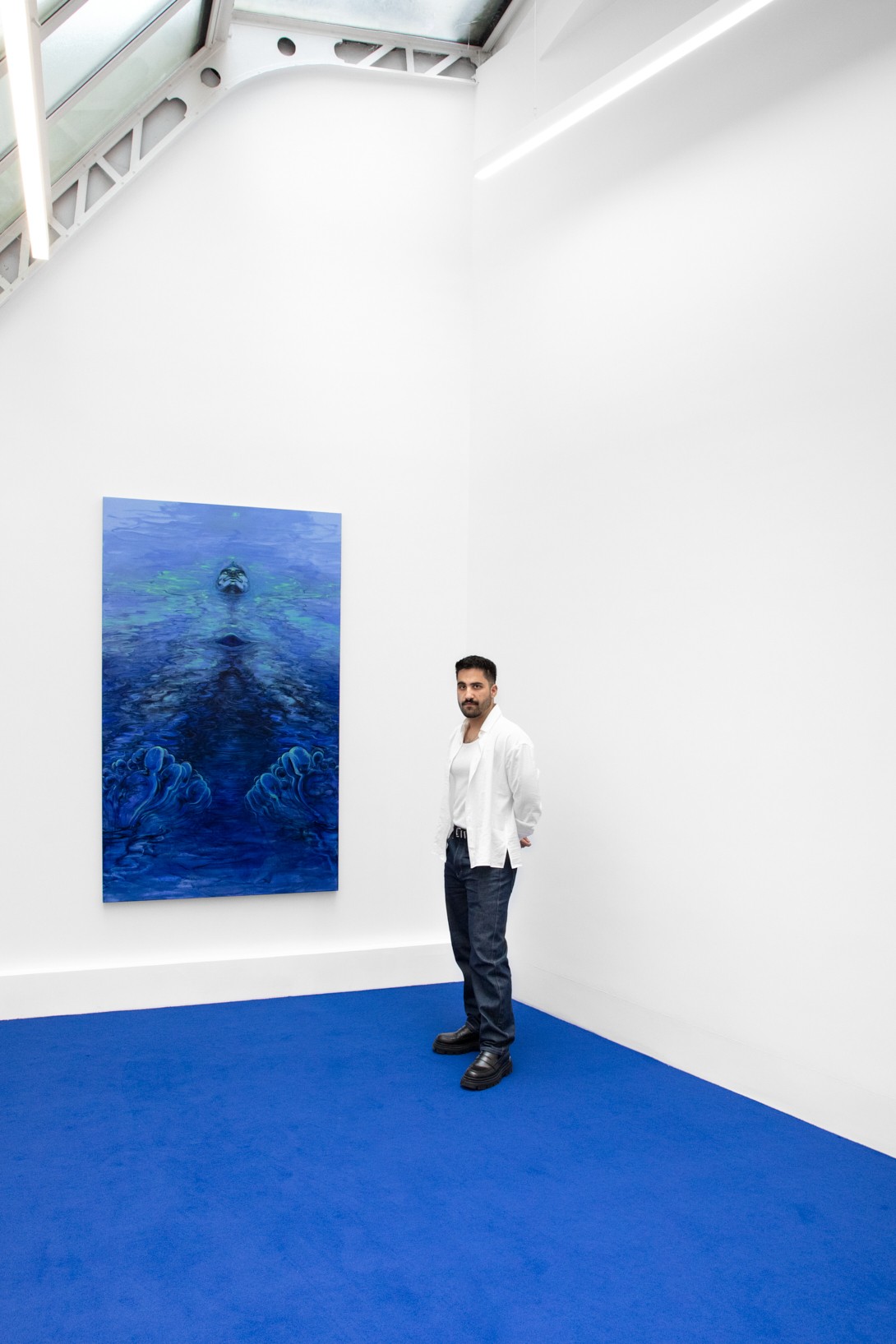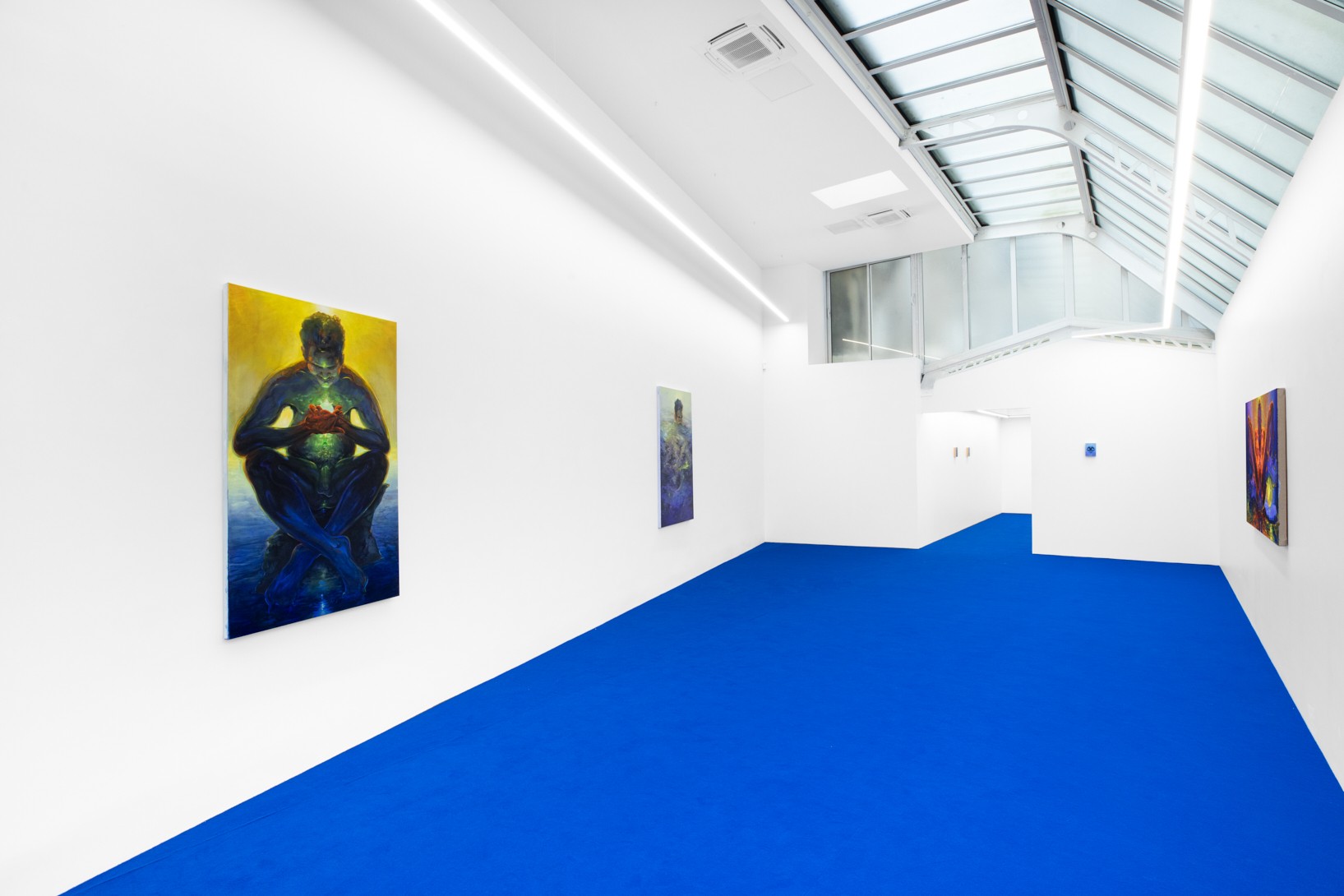 The title of the exhibition, Deeply, evokes the intensity of the emotional states of the characters, more or less immersed in water. Without positive or negative connotation, this title also allows for an open-minded interpretation of the exhibition. Cortese does not seek to make the works easily interpretable; on the contrary, he wishes to immerse the viewer in his own questions and reflections, thus fostering a meditative experience. Through precise symbolism, Cortese constructs a universe where the central character becomes the avatar of his own emotions and experiences. Each painting is thus charged with an autobiographical dimension, serving as a talisman to preserve the artist’s memories.