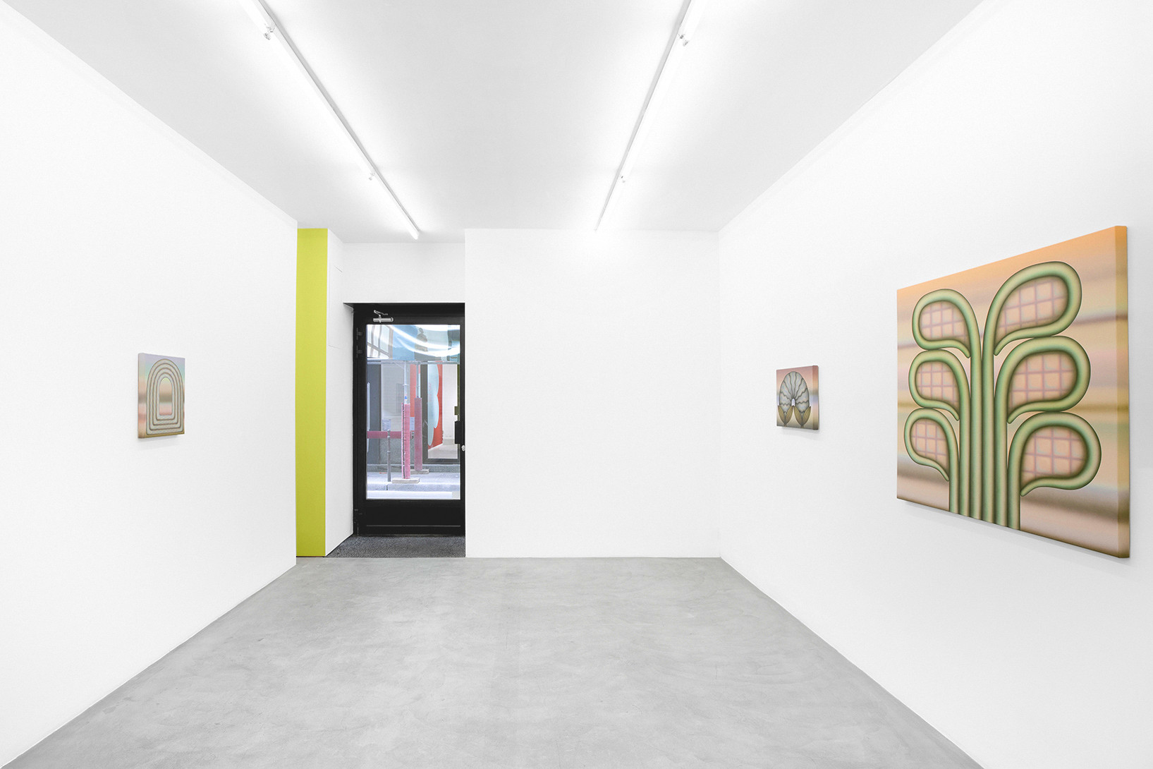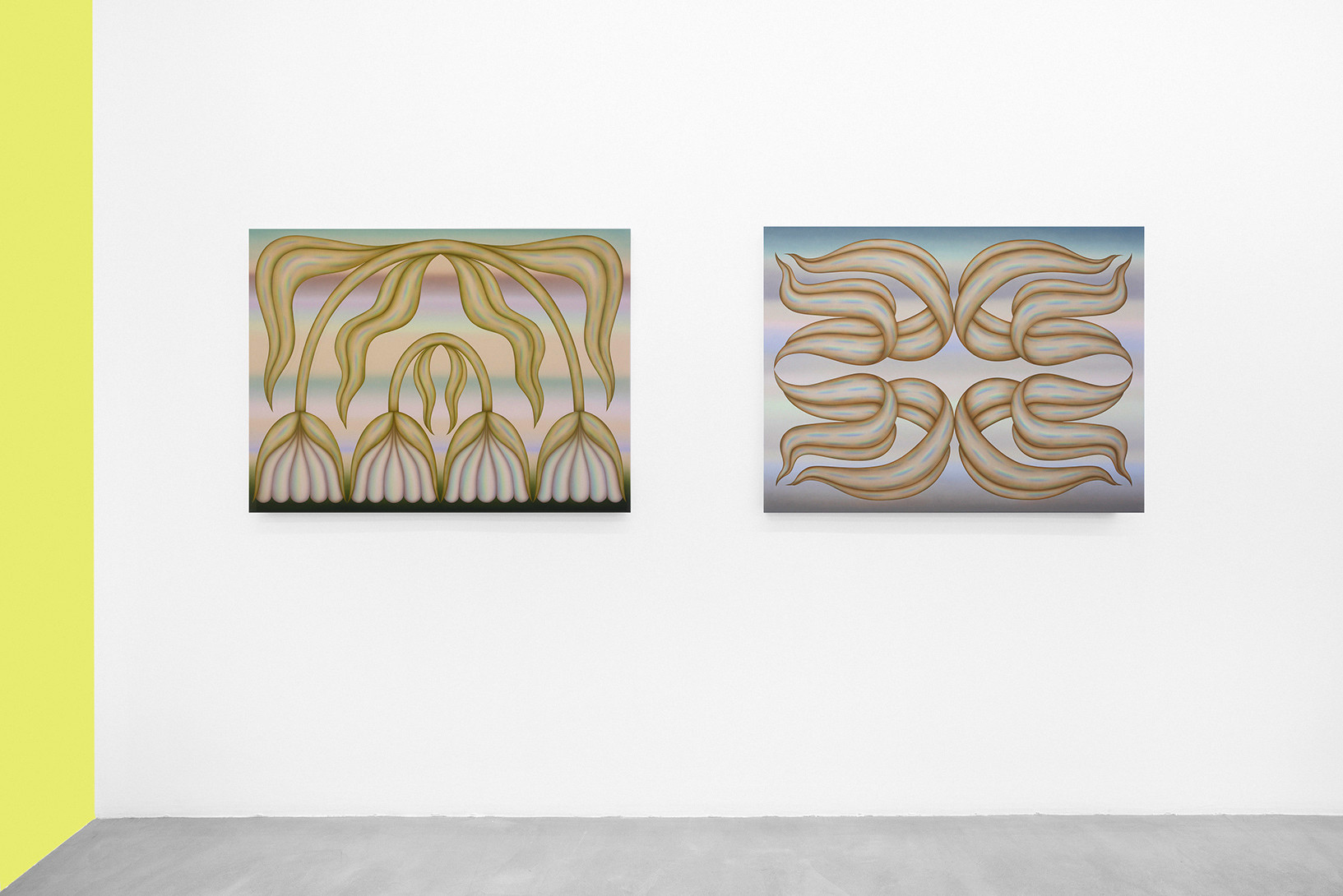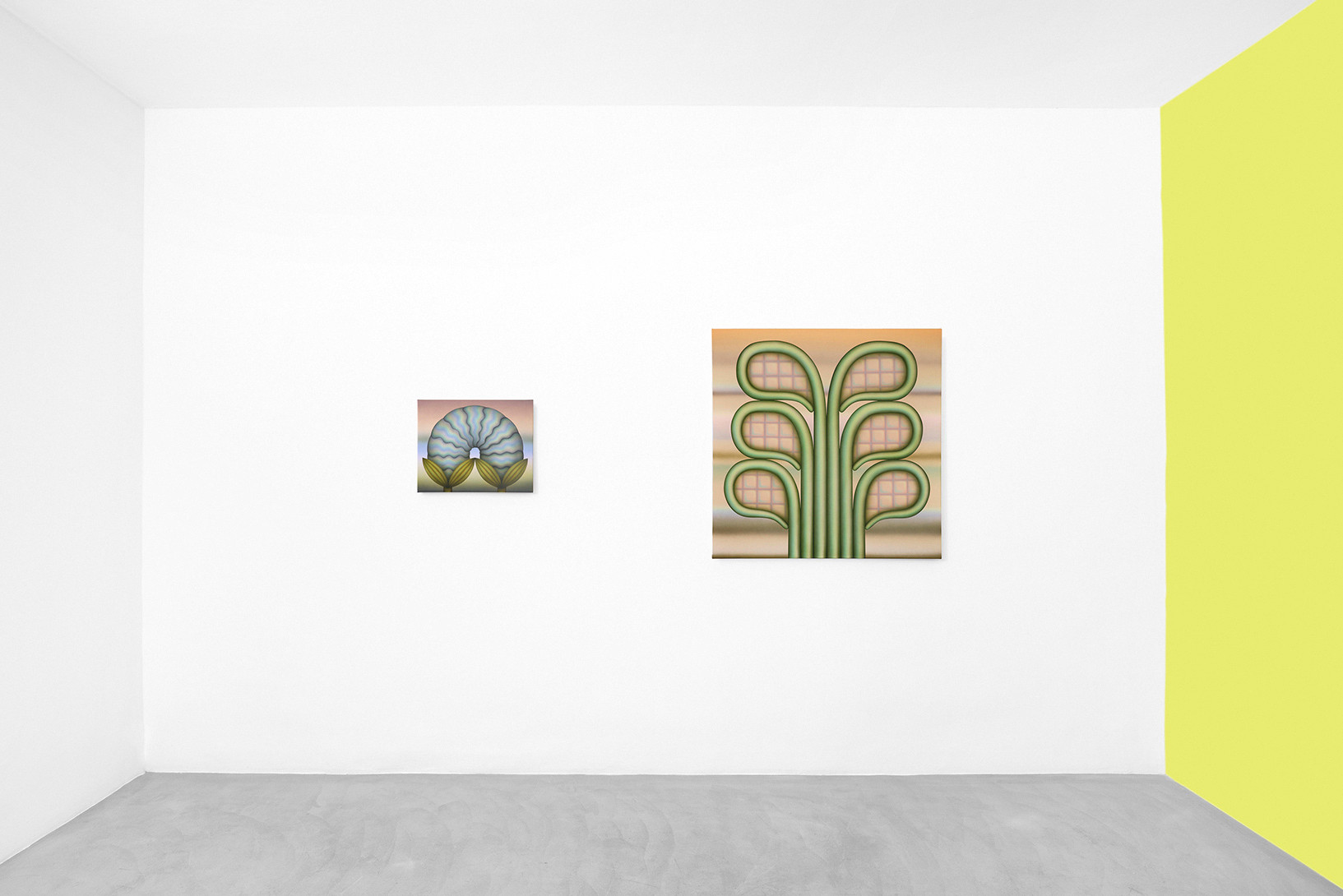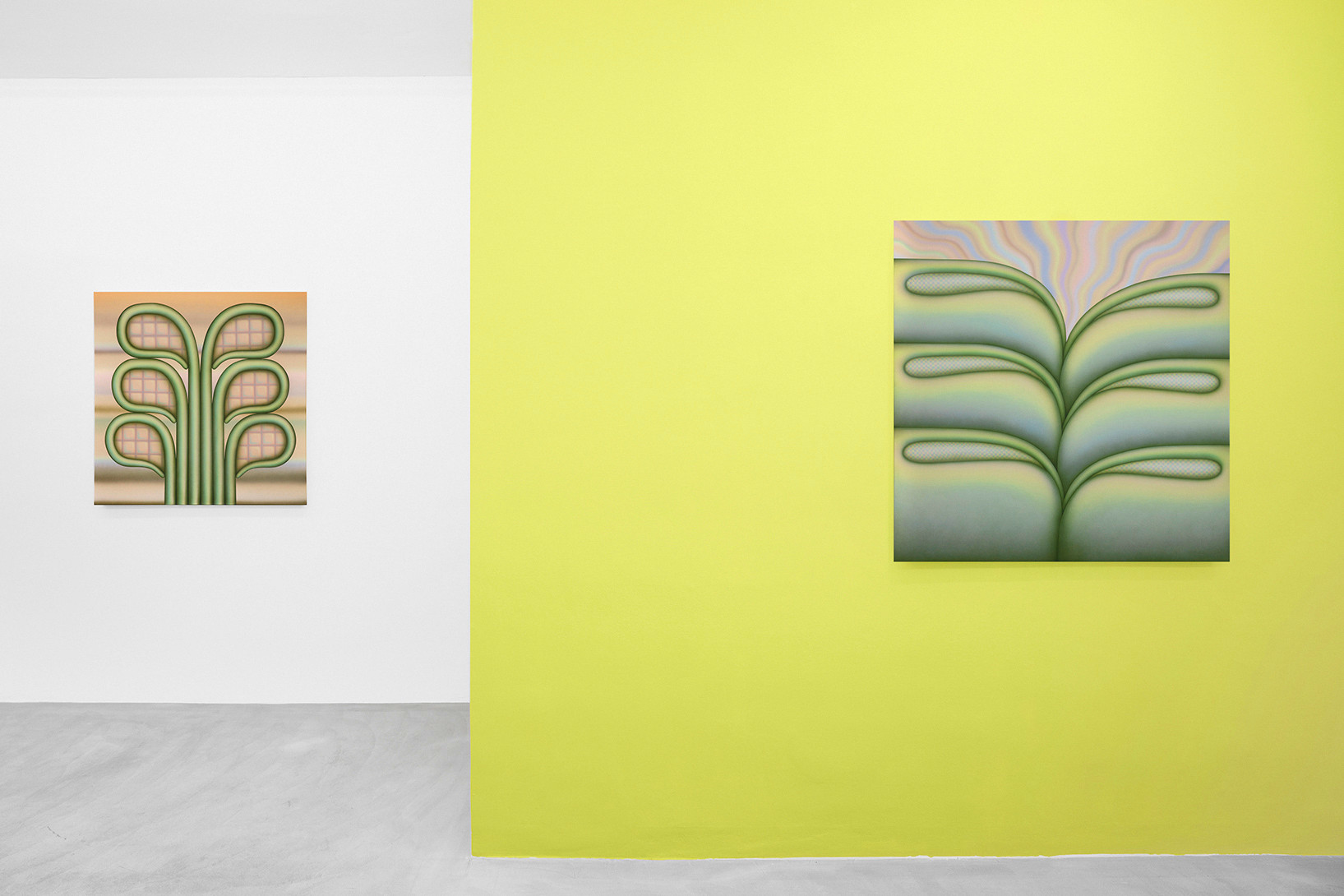 Greene’s works create a vibrant and hypnotic atmosphere in which the thin, diffuse layers of paint blend and merge into a highly recognisable pastel palette. These powdery waves of colour suspend time; they dissolve the fixed structure of the objects and exacerbate the artist’s cherished sense of ambiguity. Uncertainty then condemns the precise description of these forms, which remain free and not limited by thought.