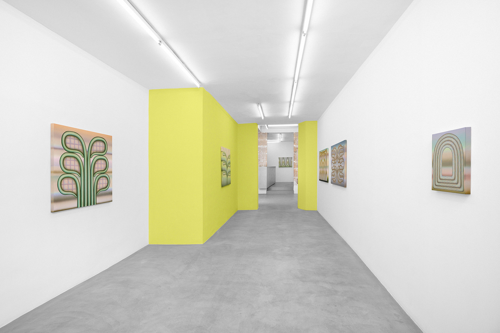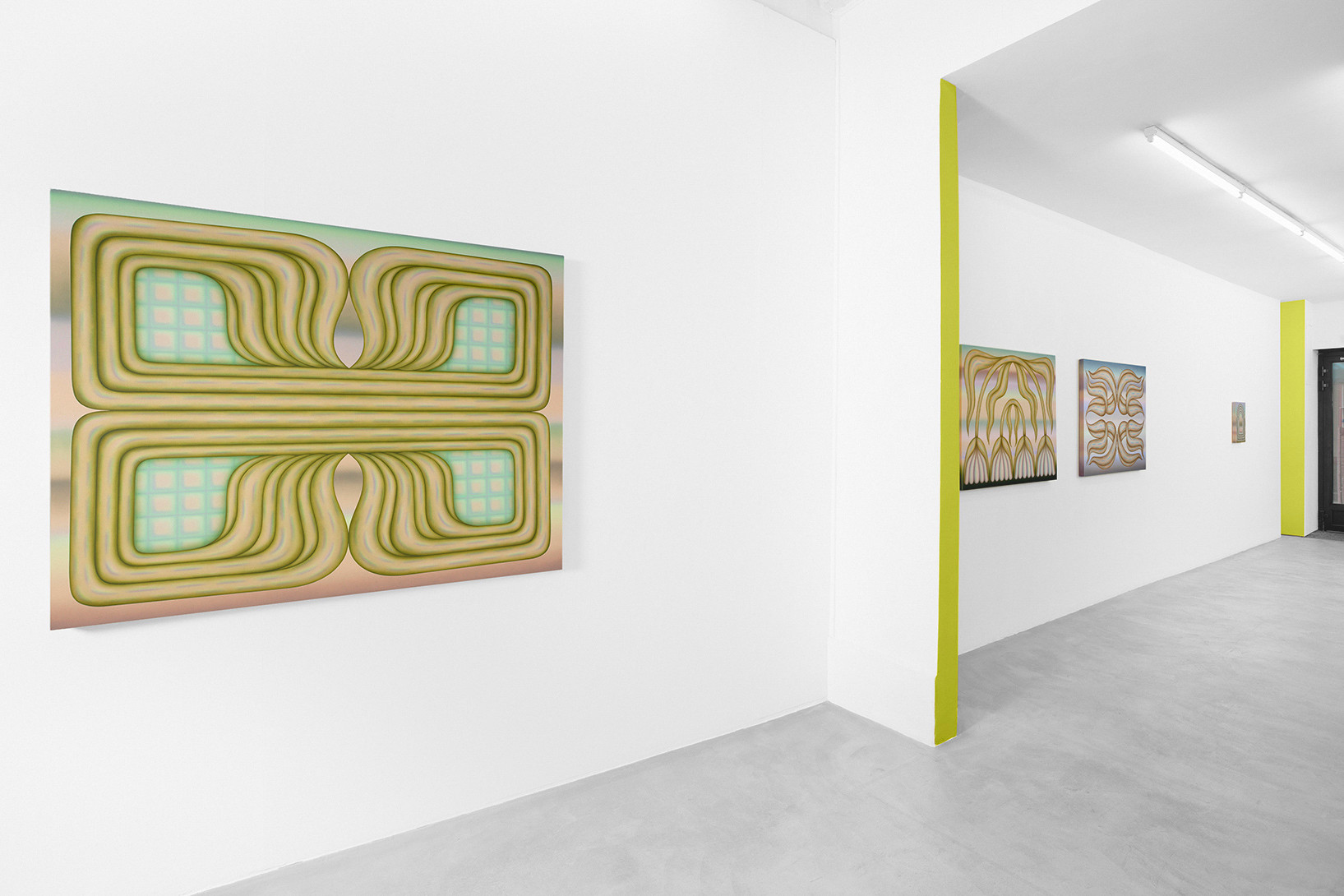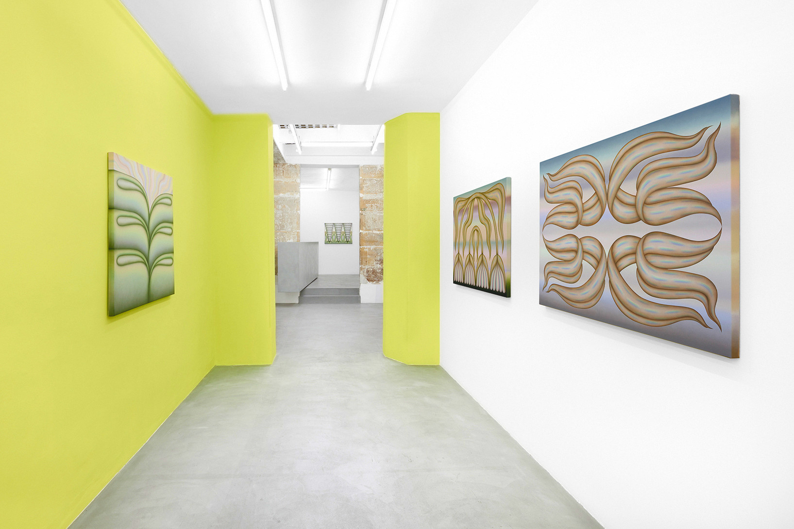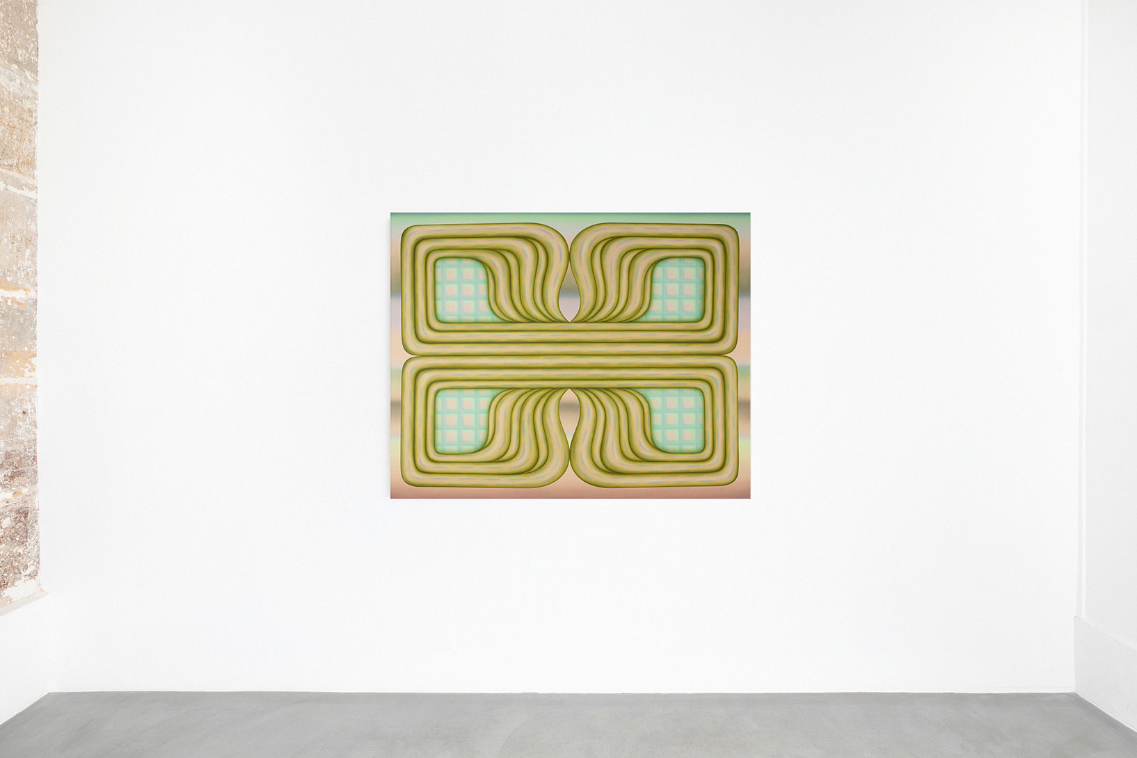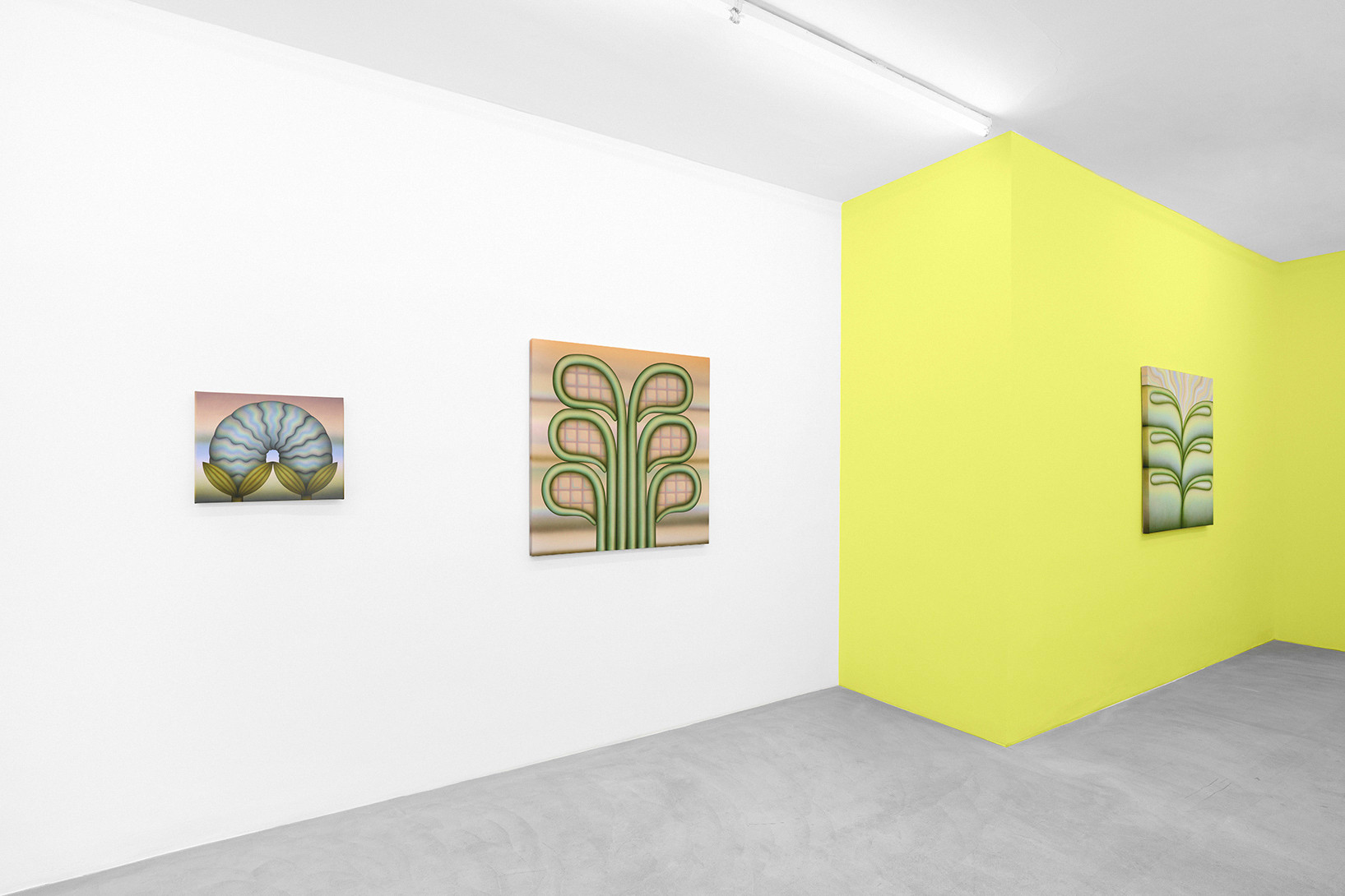Greene’s works create a vibrant and hypnotic atmosphere in which the thin, diffuse layers of paint blend and merge into a highly recognisable pastel palette. These powdery waves of colour suspend time; they dissolve the fixed structure of the objects and exacerbate the artist’s cherished sense of ambiguity. Uncertainty then condemns the precise description of these forms, which remain free and not limited by thought.