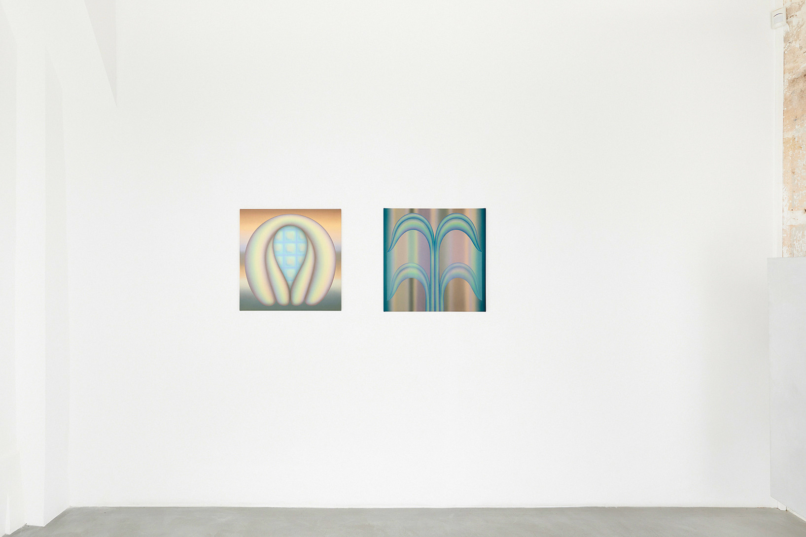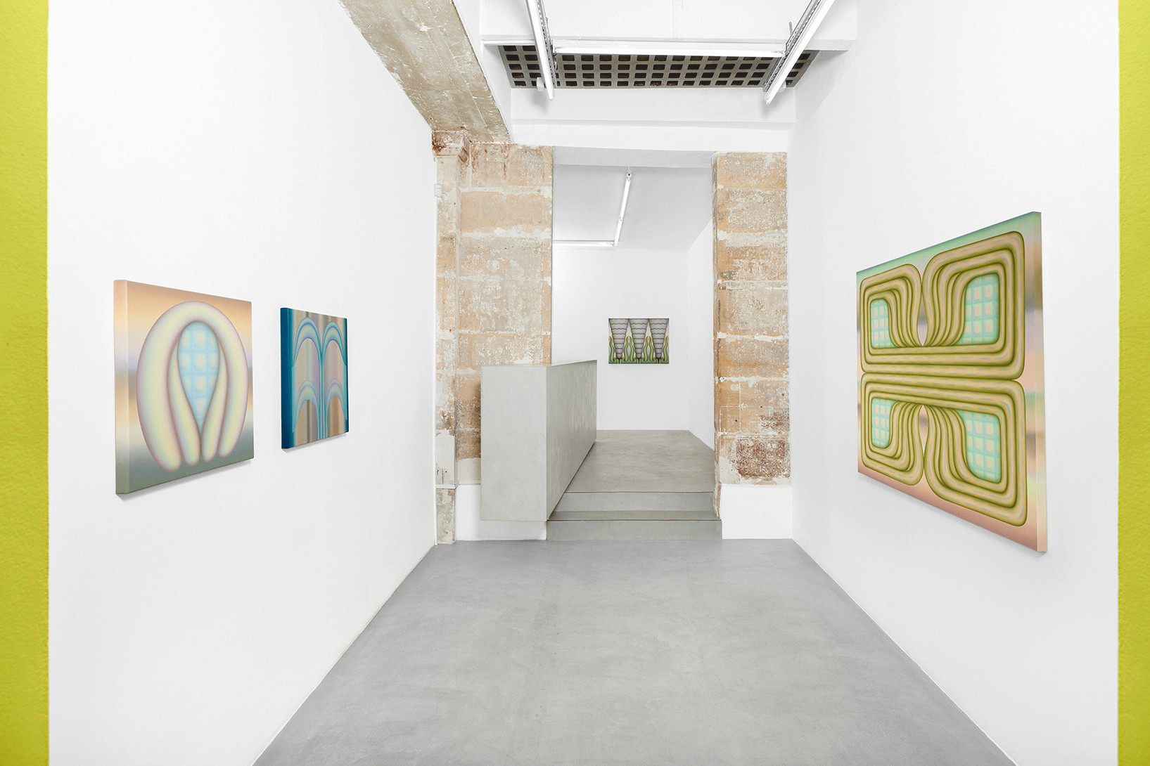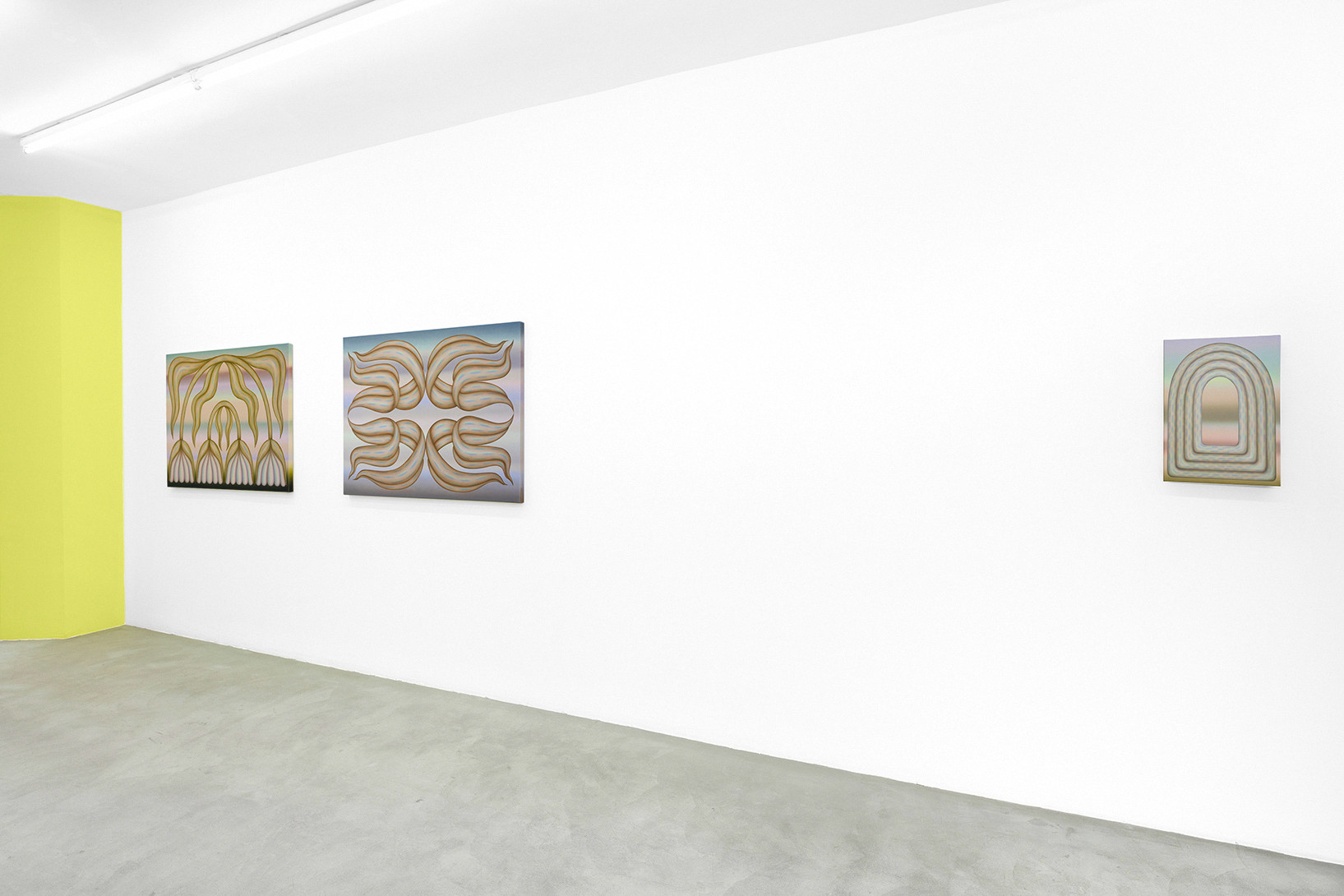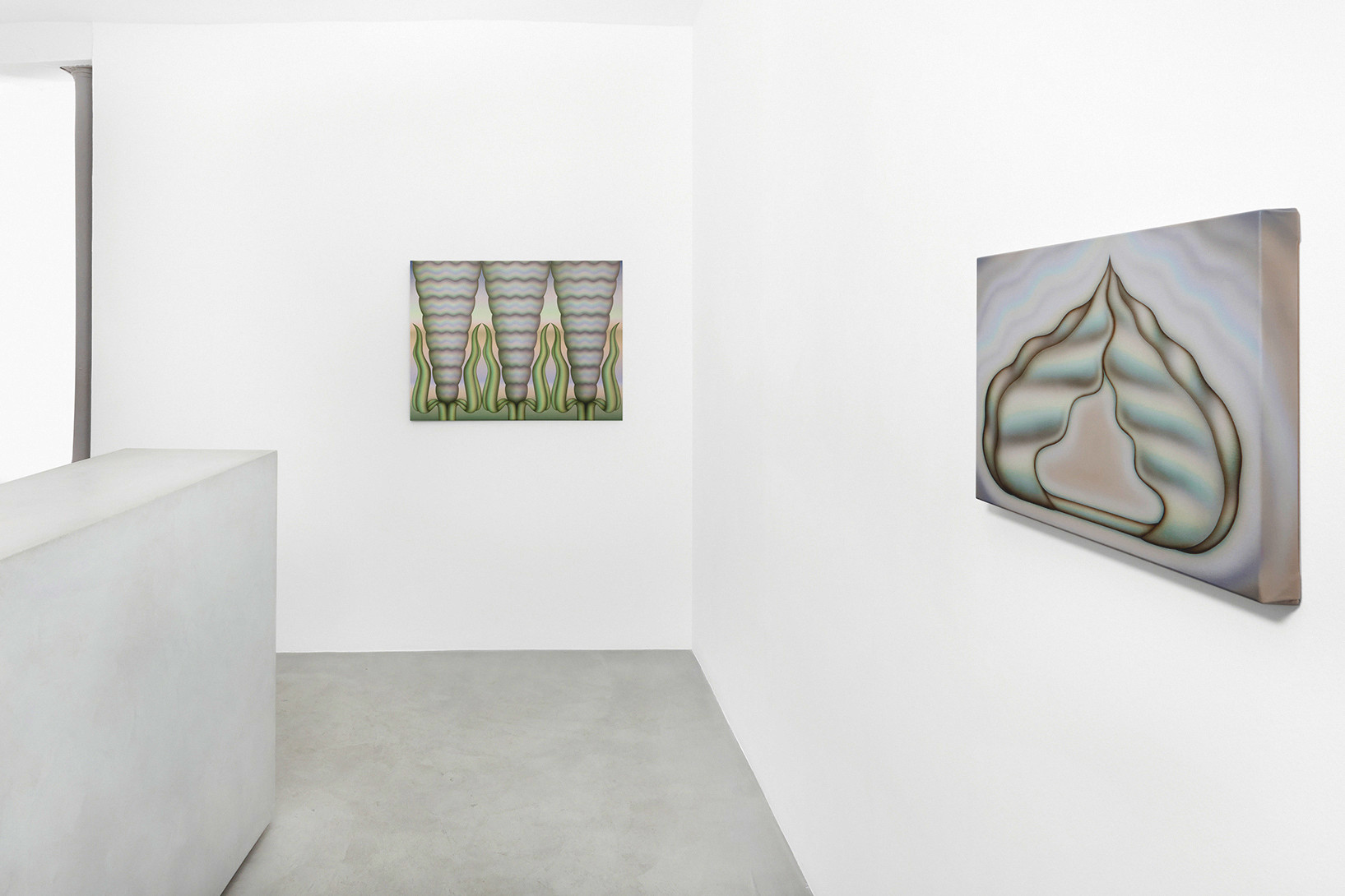Greene’s works create a vibrant and hypnotic atmosphere in which the thin, diffuse layers of paint blend and merge into a highly recognisable pastel palette. These powdery waves of colour suspend time; they dissolve the fixed structure of the objects and exacerbate the artist’s cherished sense of ambiguity. Uncertainty then condemns the precise description of these forms, which remain free and not limited by thought.