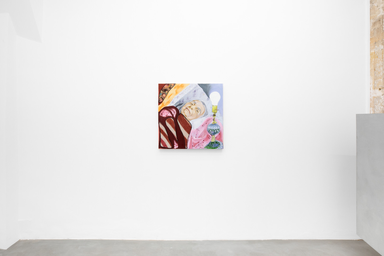 Stocki’s aesthetic interests perhaps most strikingly converge in “December.” Based off of a photograph taken by the artist, the painting captures an elderly woman lying in bed, swathed in quilts. Her placid expression falls somewhere between the viewer and a lamp bulb. Memories could reside in the lines on her face and within the naked source of light, as if she is at once gazing forwards and back in time. This woman in the winter of her life is contrasted with “May,” in which exaggerated feminine physicality finds formal agreement with the archway shape of the canvas. There is certainly a photographer’s logic at play in both paintings. Seemingly disparate images coax significations from each other, a dual memento mori.