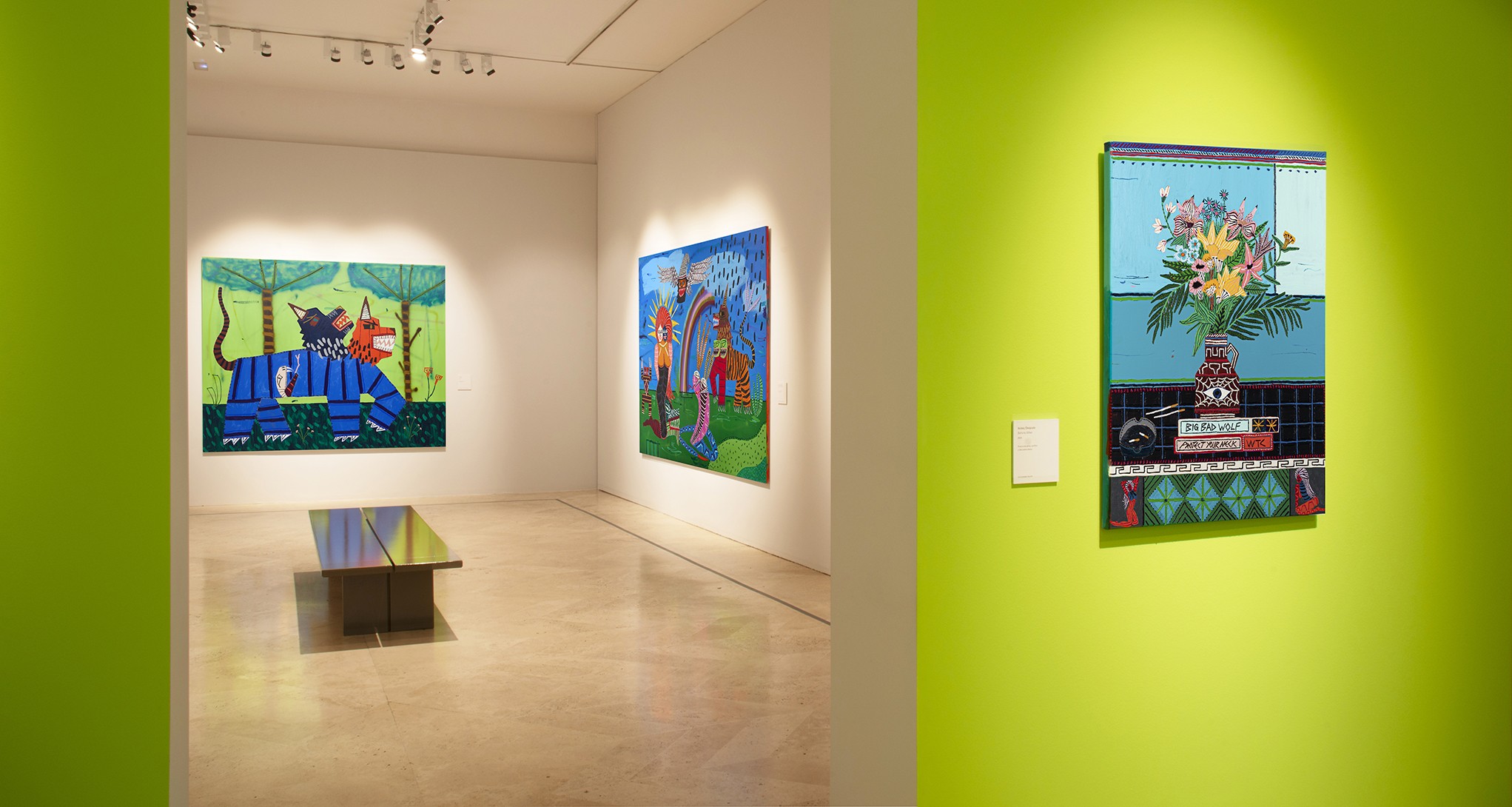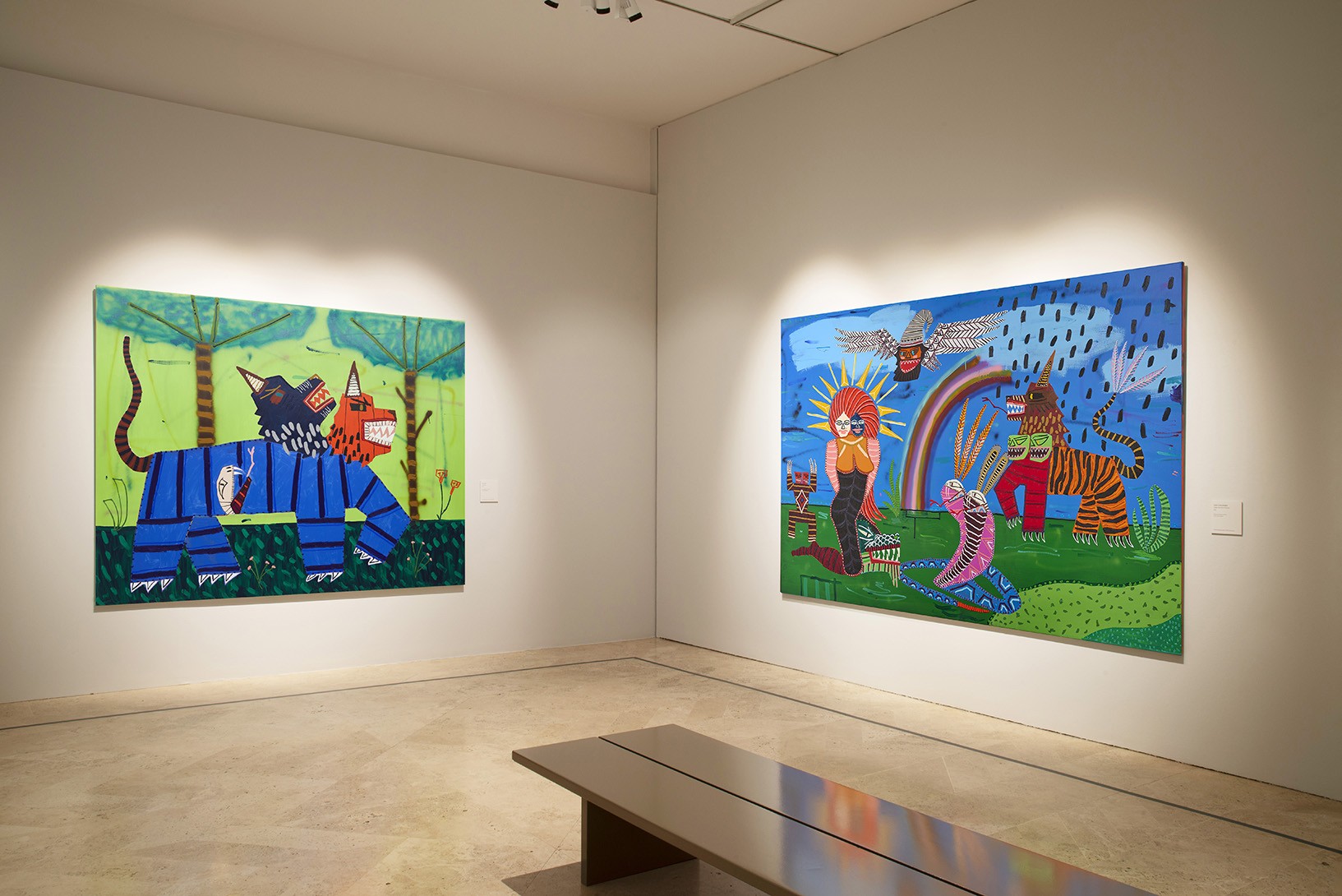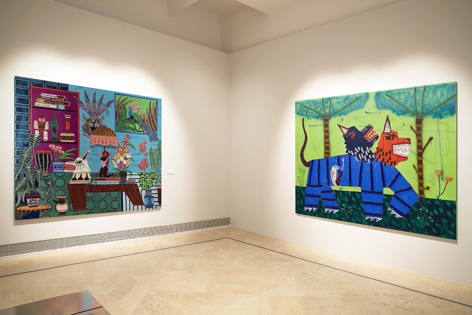 During the early years of his career Kerwick painted still lifes. Initially characterised by muted tones, they became increasingly colourful with a wider range of details. These interior scenes then started to include a camouflaged cobra and a tiger; fantastical creatures which subsequently moved outdoors, into jungle landscapes inhabited by lions and wolves but also by unicorns, the majority with two heads. Kerwick’s most recent paintings are more complex, narrative compositions that evoke an entire mythology and, in some cases, depict a female divinity.