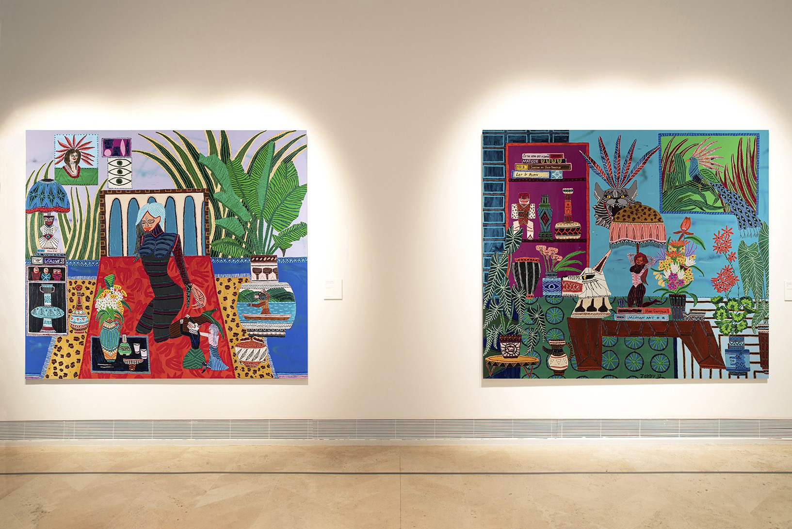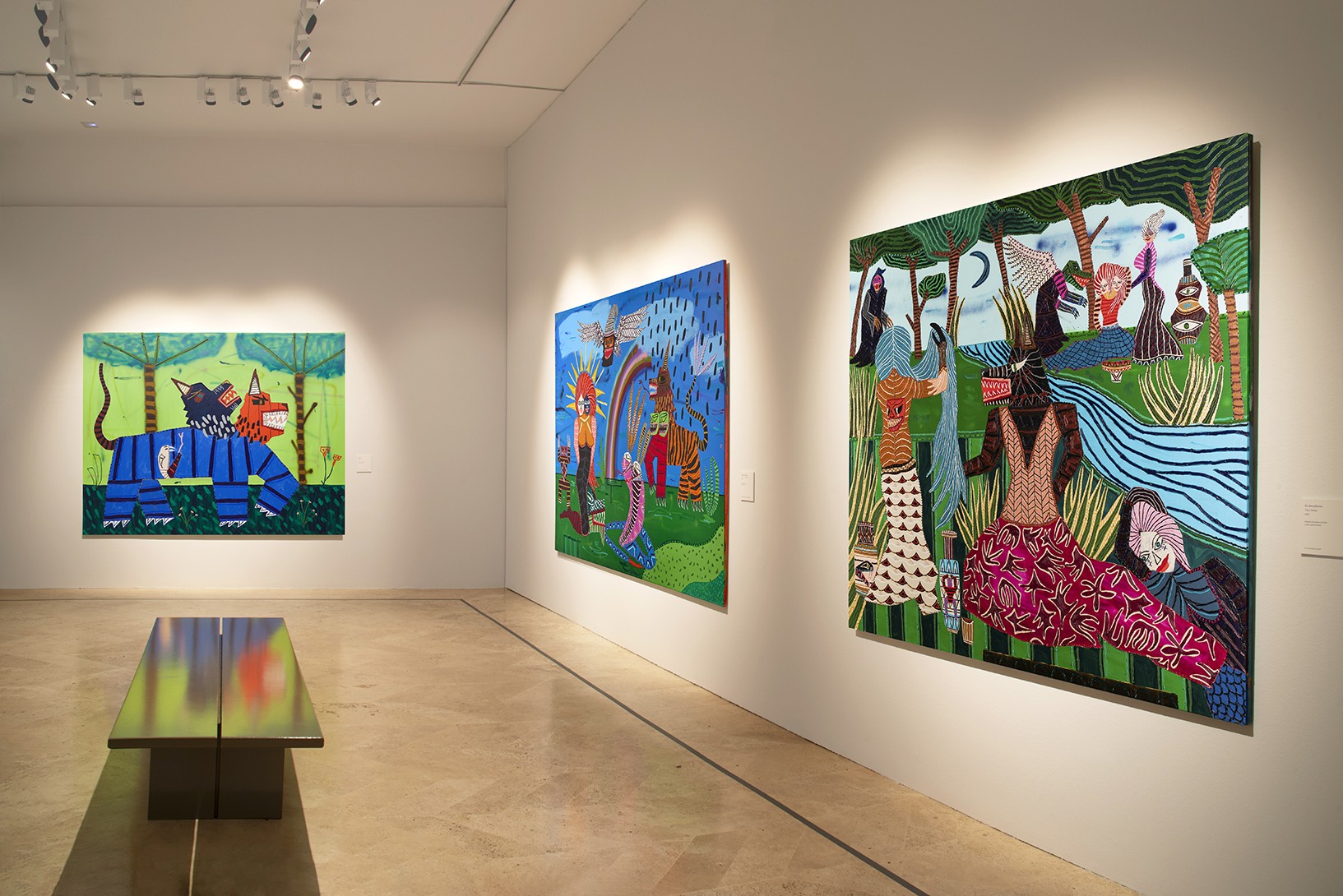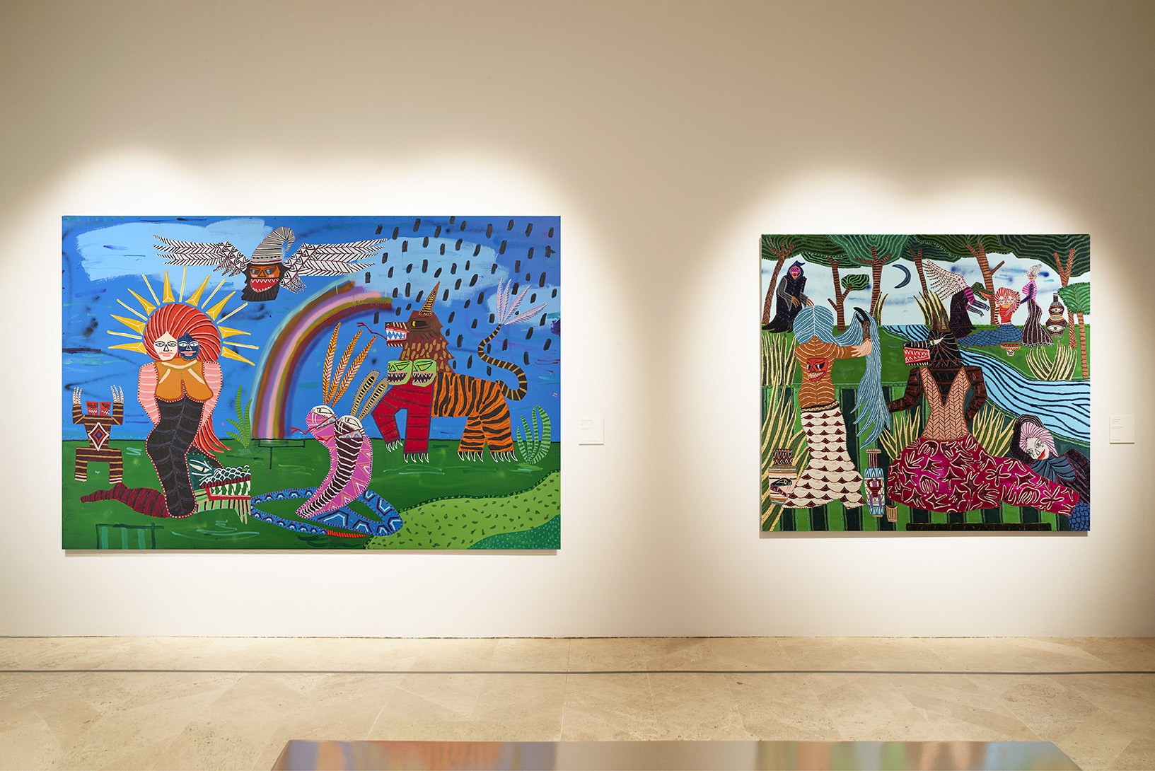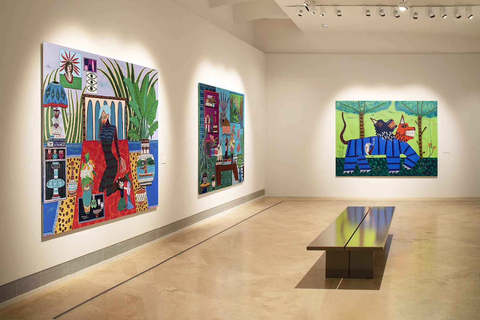 During the early years of his career Kerwick painted still lifes. Initially characterised by muted tones, they became increasingly colourful with a wider range of details. These interior scenes then started to include a camouflaged cobra and a tiger; fantastical creatures which subsequently moved outdoors, into jungle landscapes inhabited by lions and wolves but also by unicorns, the majority with two heads. Kerwick’s most recent paintings are more complex, narrative compositions that evoke an entire mythology and, in some cases, depict a female divinity.