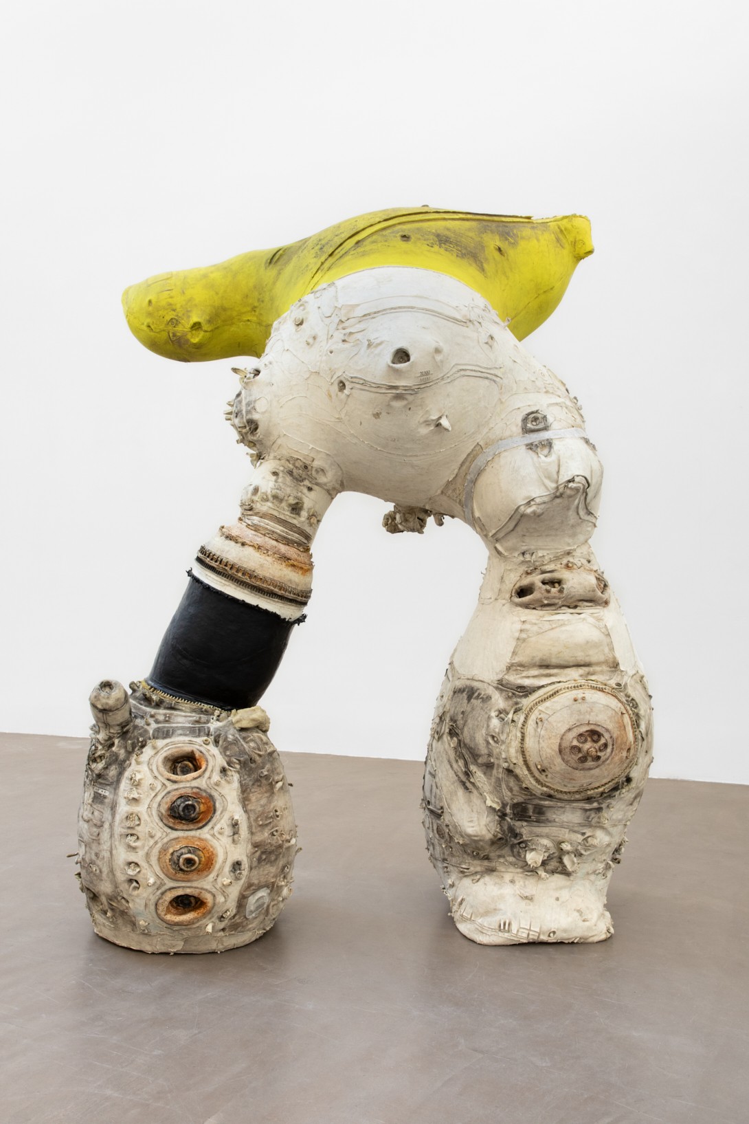 For this exhibition, Ken Sortais created latex sculptures from engines or mechanical debris found in junkyards, assembling them with various imprints made on classical statues. These mechanical elements gradually invade the human body until they completely merge with it. For the artist, the grafting process recalls the erotic and morbid atmosphere of J.G. Ballard’s book “Crash,” which explores the link between sexual perversion and car accidents. His characters seem to be the result of such accidents, where flesh and steel unite. Ken Sortais shapes hybrid creatures with an anthropomorphic appearance, half-human, half-machine, reflecting internal harmony and discord. The created sculptures become physical witnesses to this duality.
