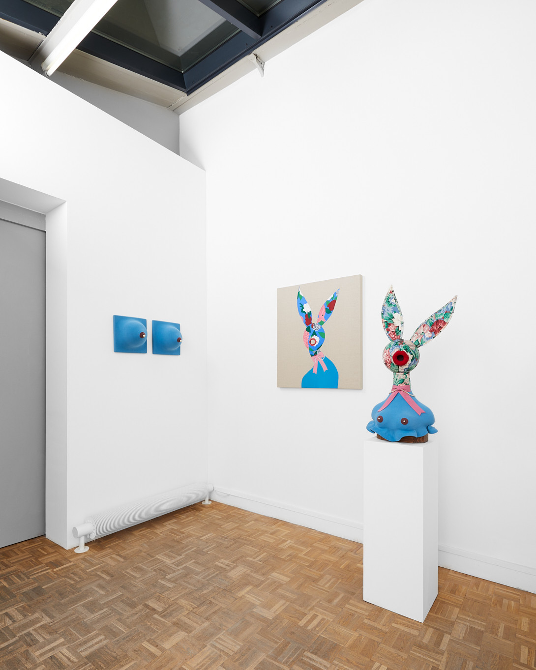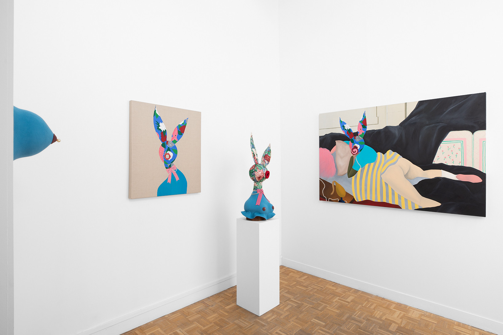 Dominated by the Playboy bunny-like characters, the paintings are referencing a wide range of classical works in which women are used as a symbol or a decorative element rather than unique individuals. Hyper sexualized and objectified they sometimes expand into sculptural sphere with features that show the superficial and forced perfection on the surface while covering up the literal and figurative hollowness underneath.