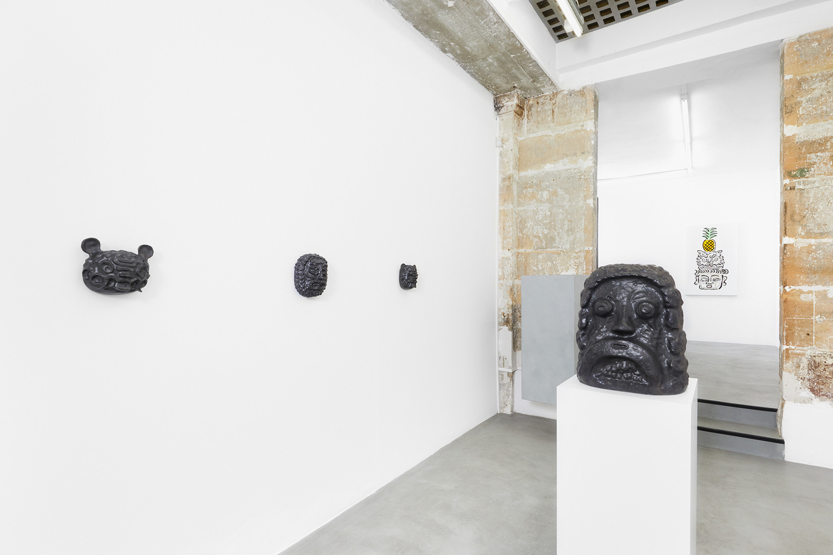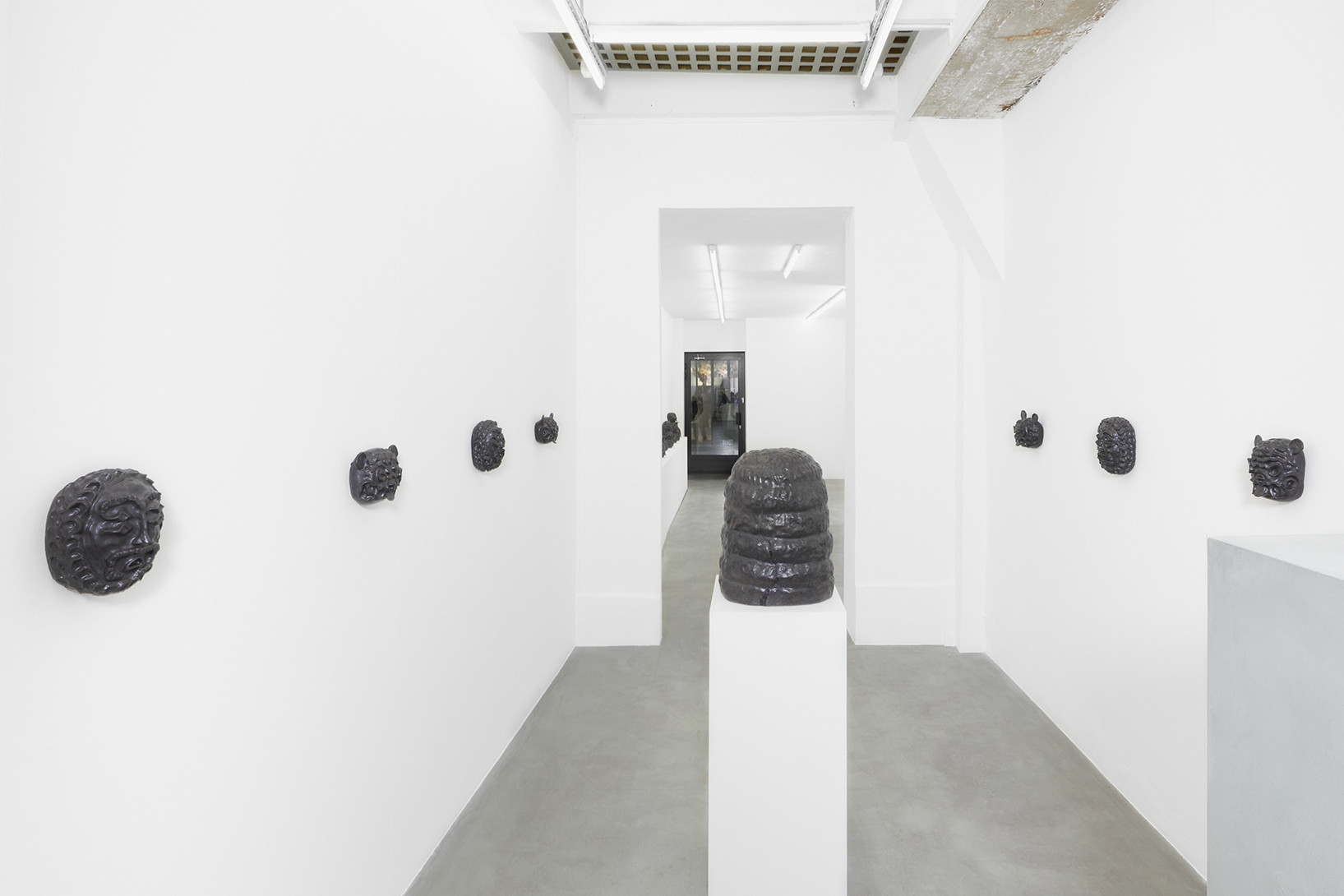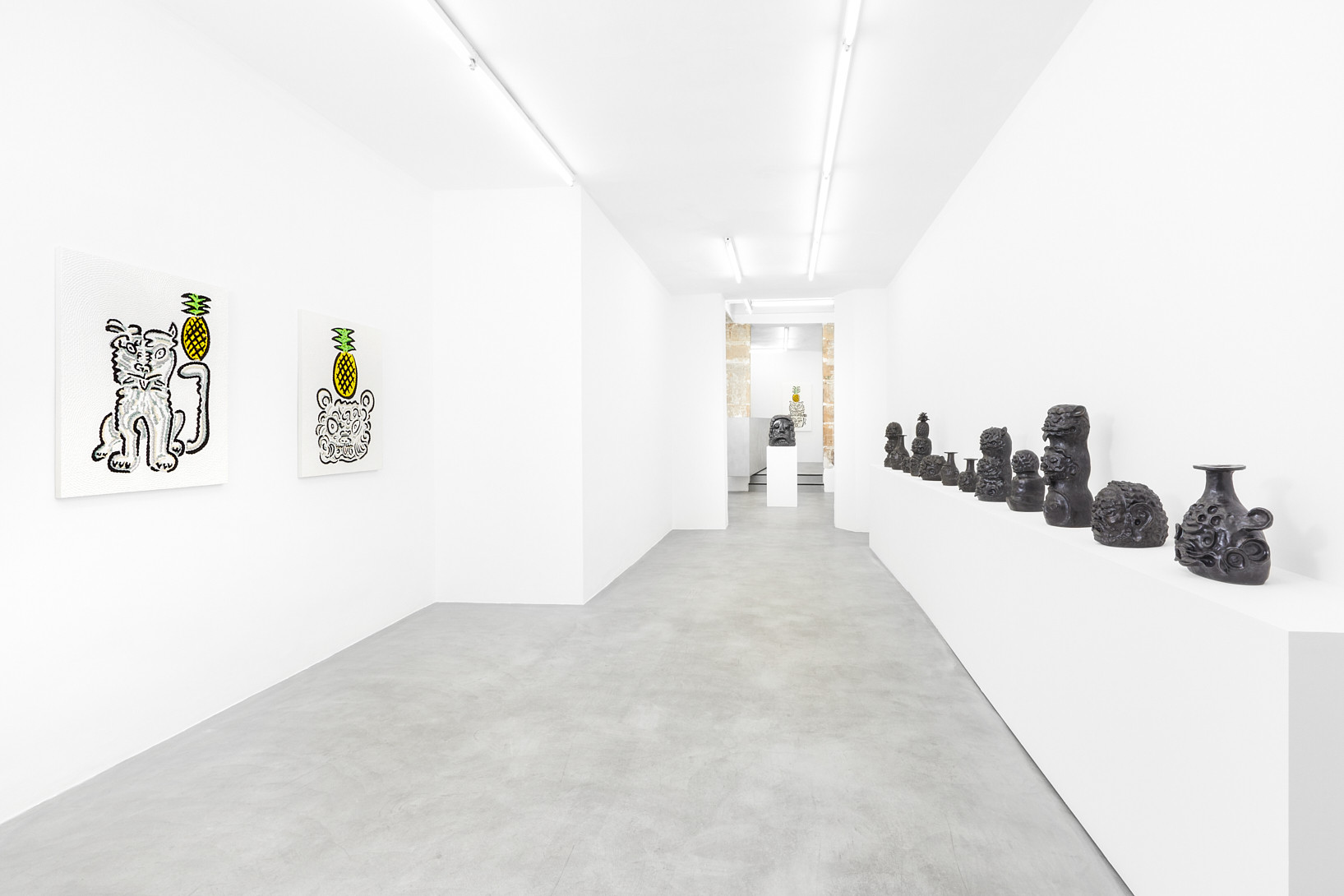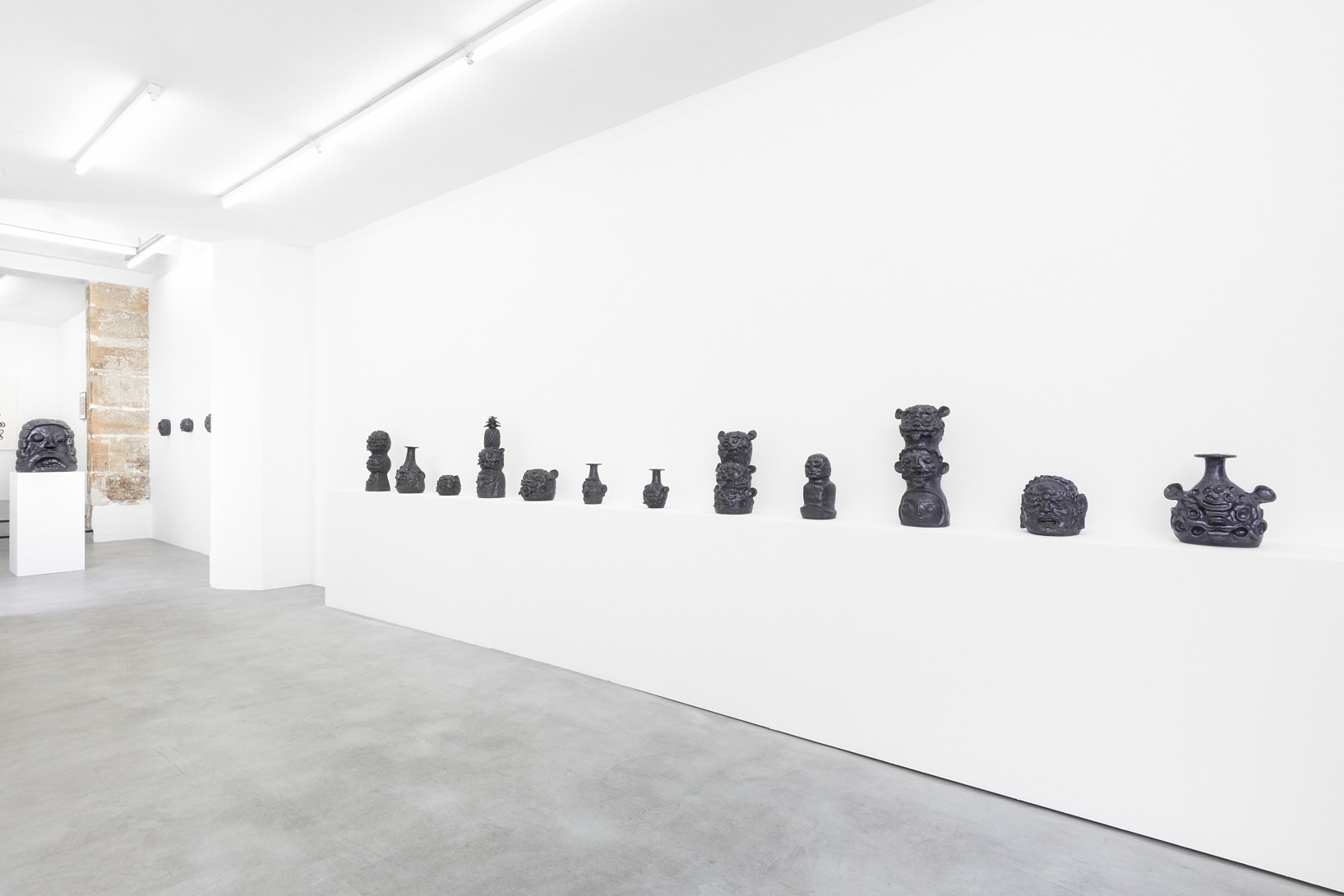 The work of Kazuma Koike does not have a specific meaning encoded in it. It is meant to appear as if it belongs nowhere, creating a floating feeling that is heightened by the gallery’s white walls. For his first solo exhibition in Europe, the artist shows twenty black-glazed ceramic figurines as well as some textured paintings assembled with a color touch to create the illusion of vibration. His mysterious creatures sharing animal and human traits are the result of combining images from various places and periods, an approach influenced by his childhood growing up in three countries: Japan, Spain and Argentina.