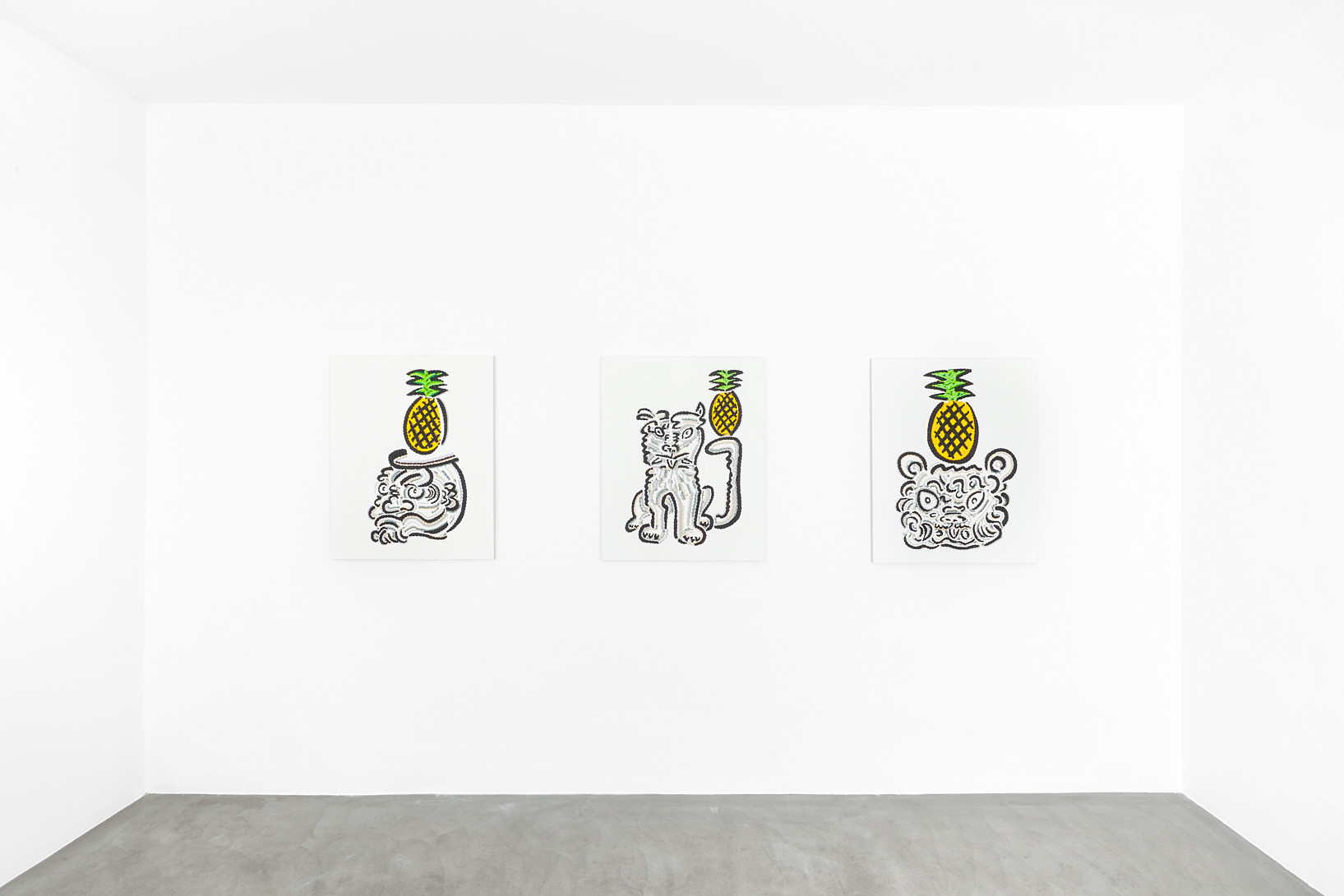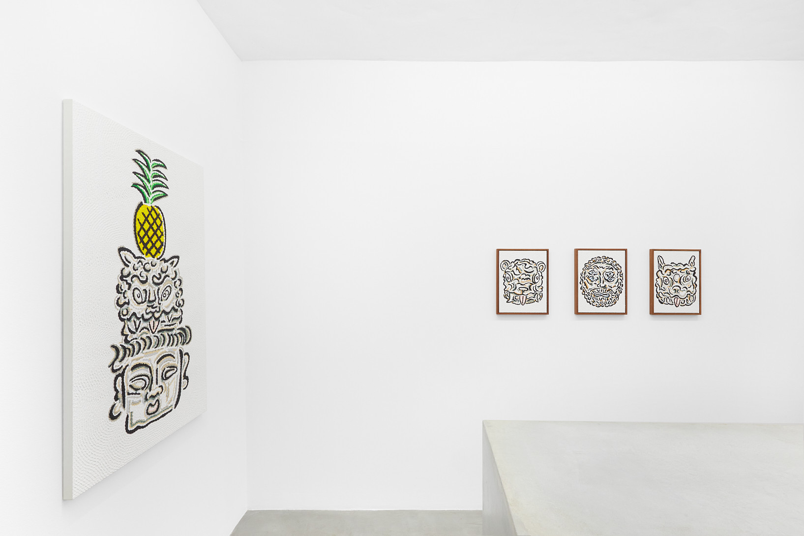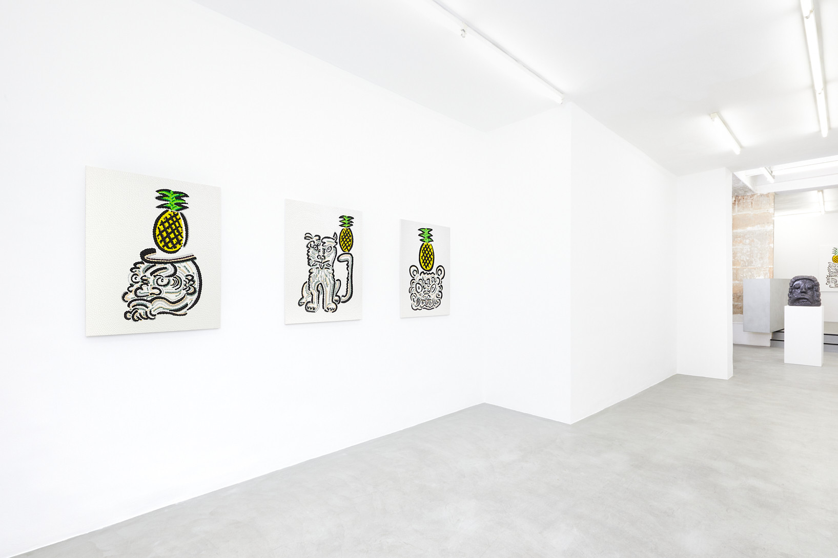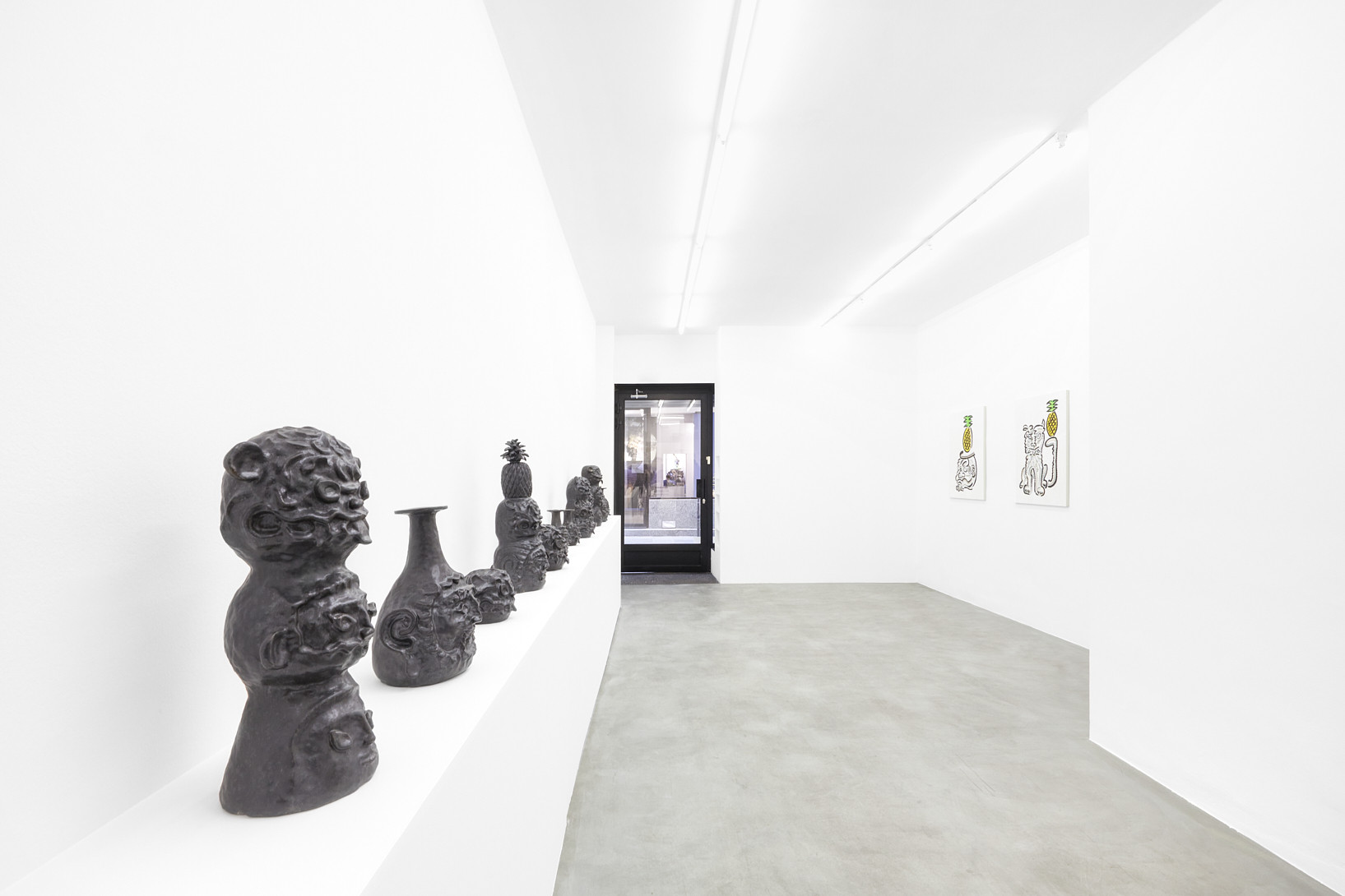 The work of Kazuma Koike does not have a specific meaning encoded in it. It is meant to appear as if it belongs nowhere, creating a floating feeling that is heightened by the gallery’s white walls. For his first solo exhibition in Europe, the artist shows twenty black-glazed ceramic figurines as well as some textured paintings assembled with a color touch to create the illusion of vibration. His mysterious creatures sharing animal and human traits are the result of combining images from various places and periods, an approach influenced by his childhood growing up in three countries: Japan, Spain and Argentina.