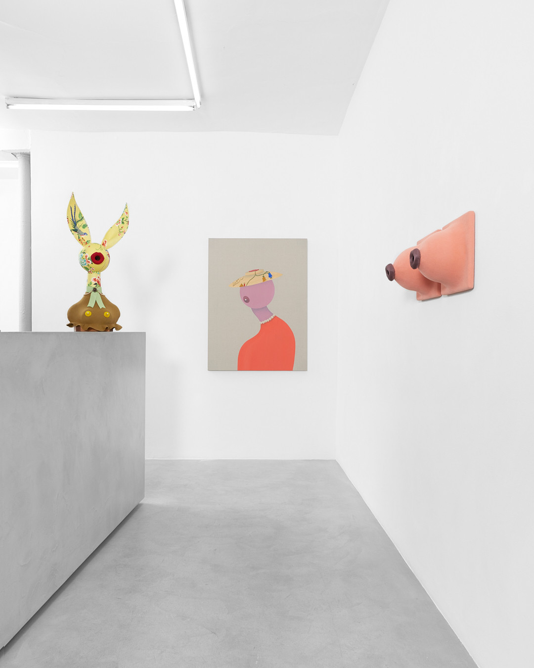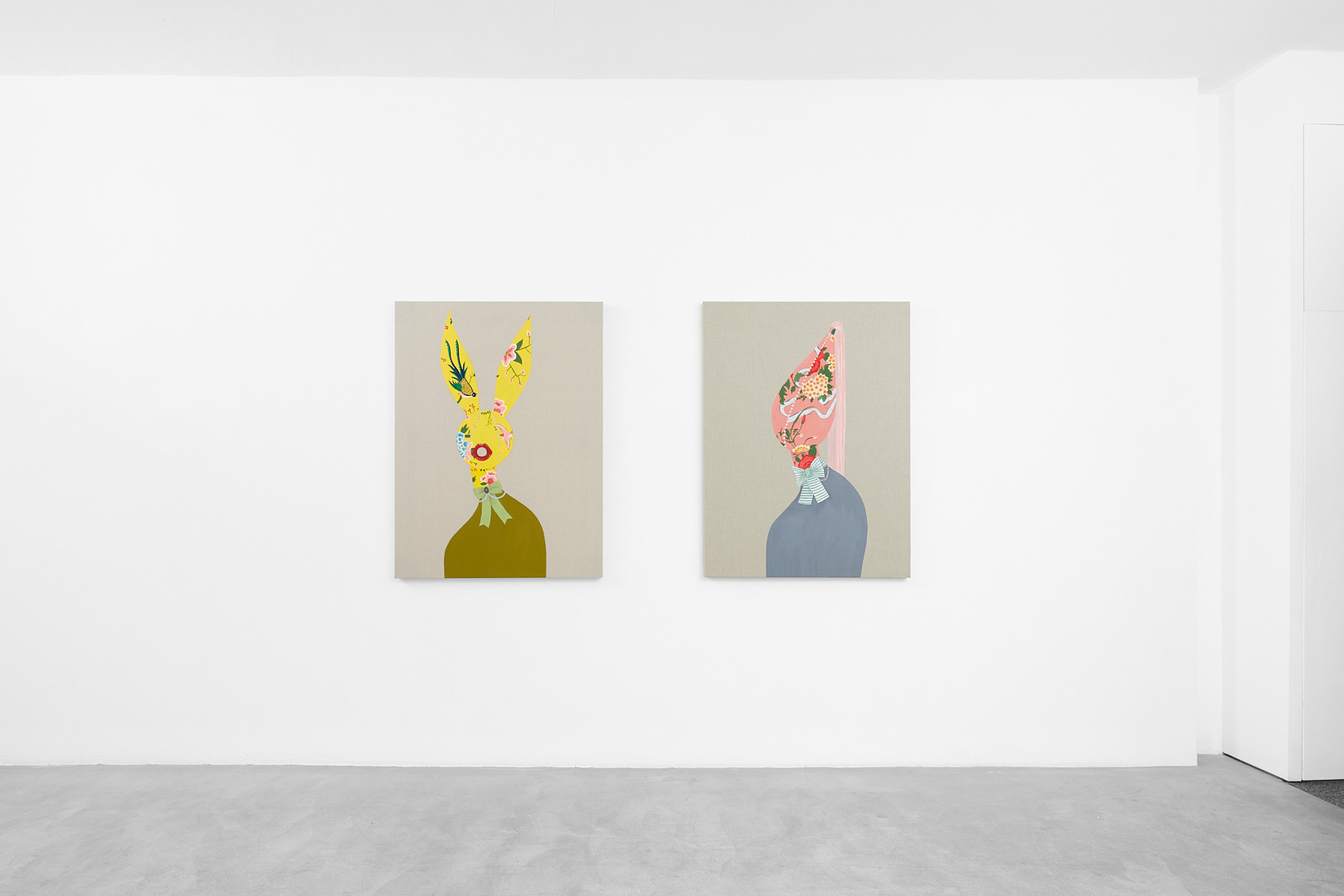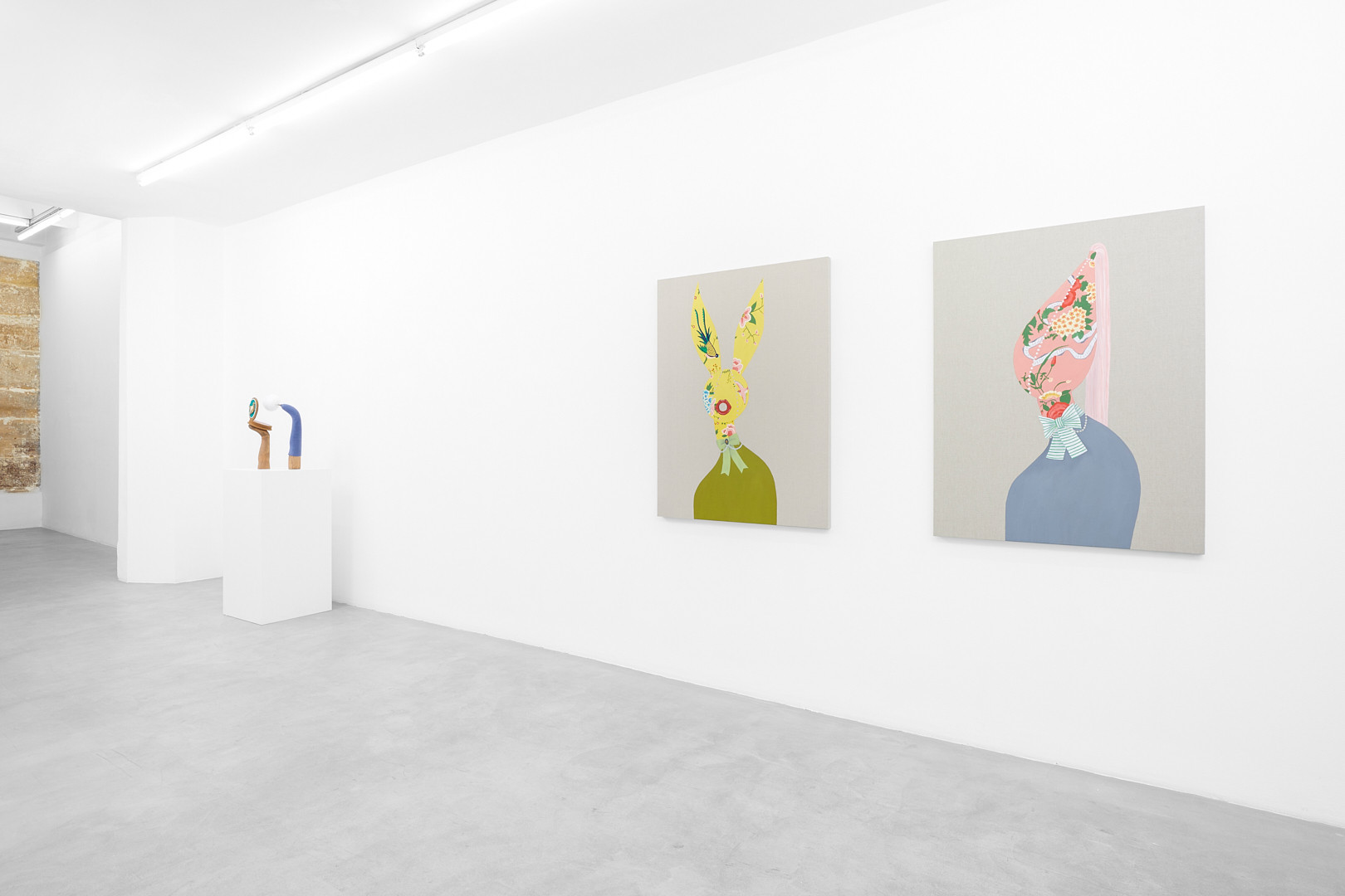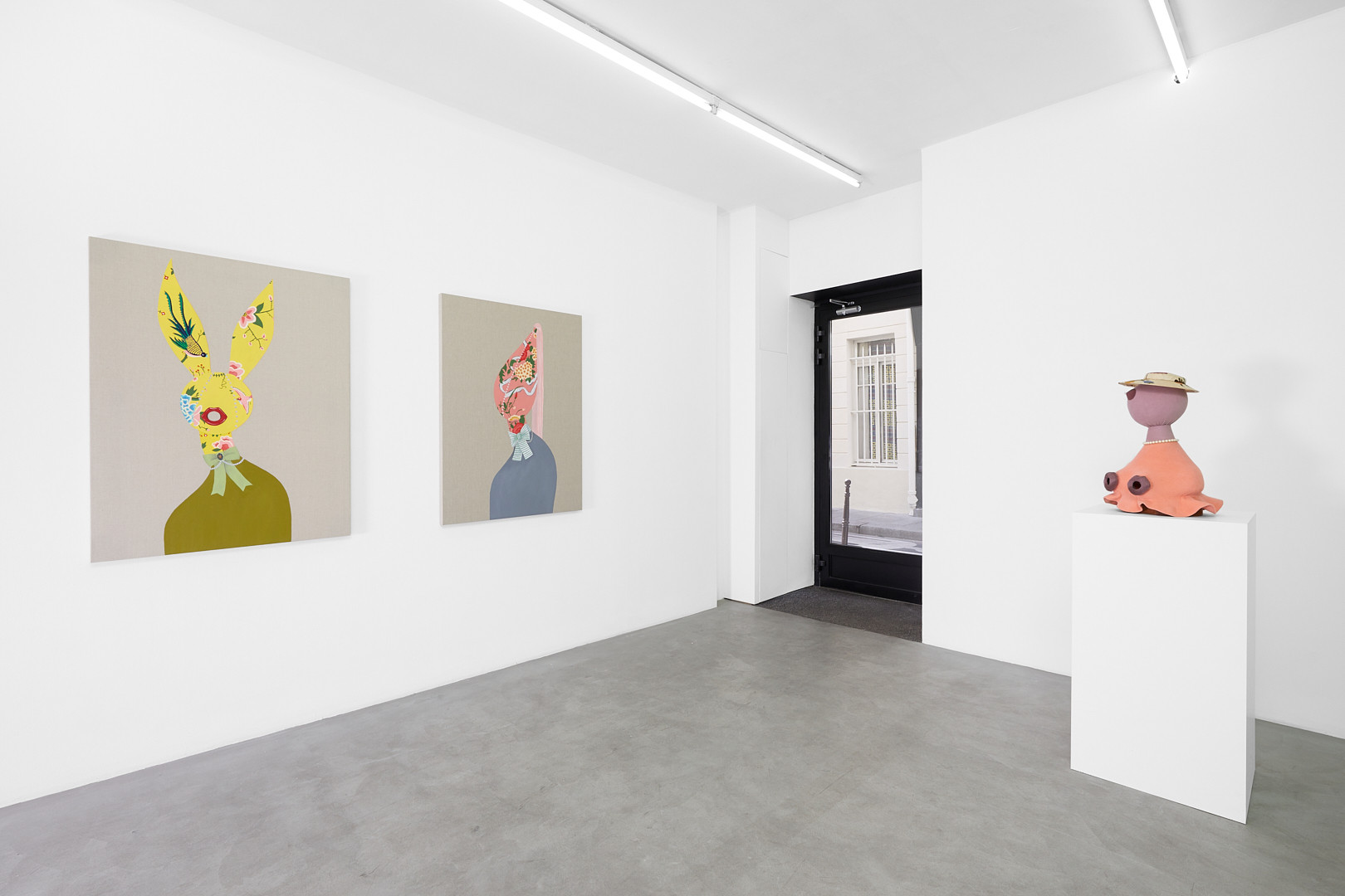 As Ryan Wilde explains, she wanted to stage “the American interpretation of French beauty, all in excess and humor.” The tone is casual, without pretention. Voluntarily girly and even silly. Just like the colors — from yellow to pink — or the wallpaper patterns. In these “mise-en-scene” of a masquerade, visions of innocence go along with coquetry. The cute costumes suddenly become protection. As for the parts of the woman’s body, they appear fragmented, enlarged or inverted. The mouth takes the place of the nipples, the breasts curl up in the palms of the hands. Only the eyes are absent, as if they were the only ones that the artist did not want to give us.