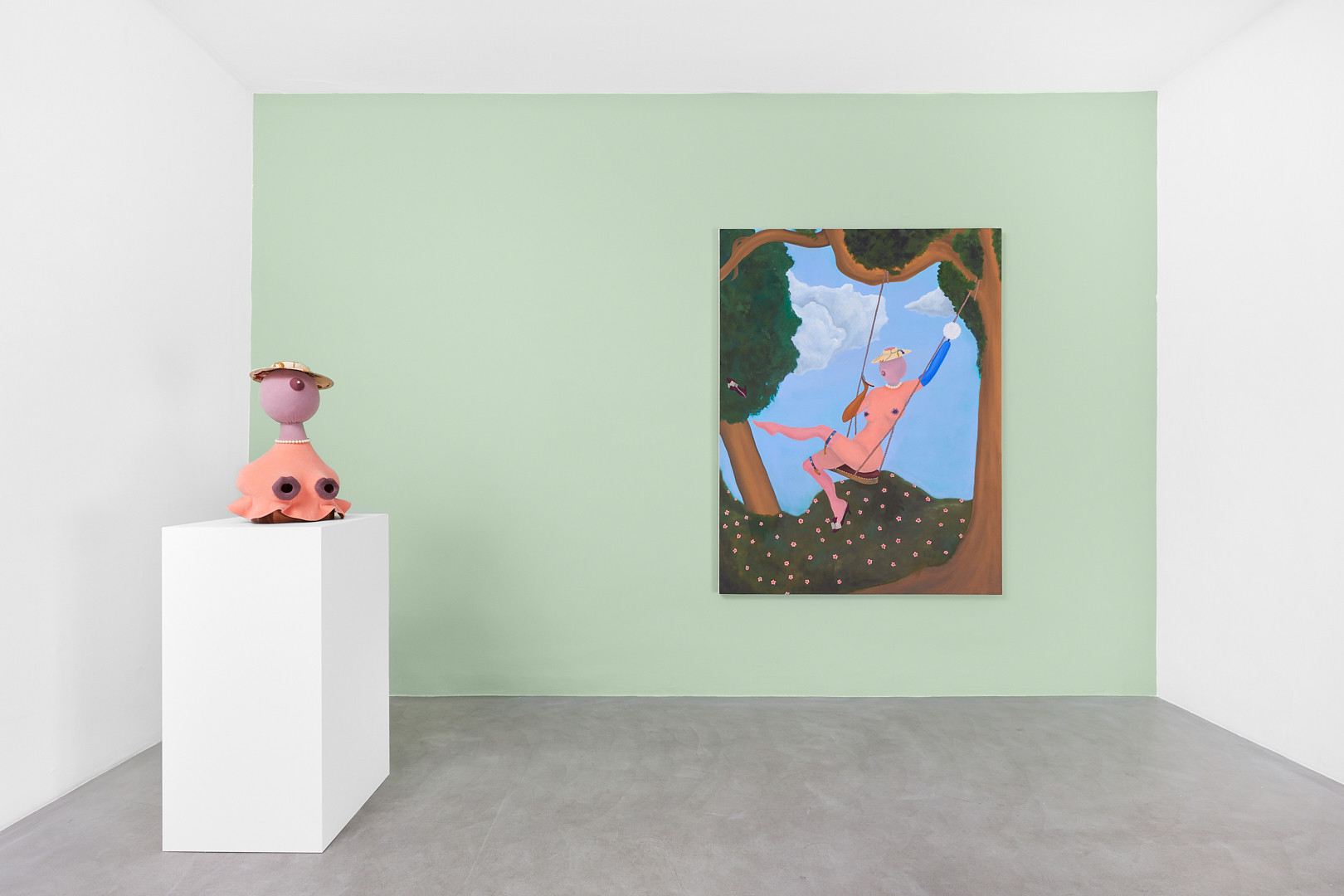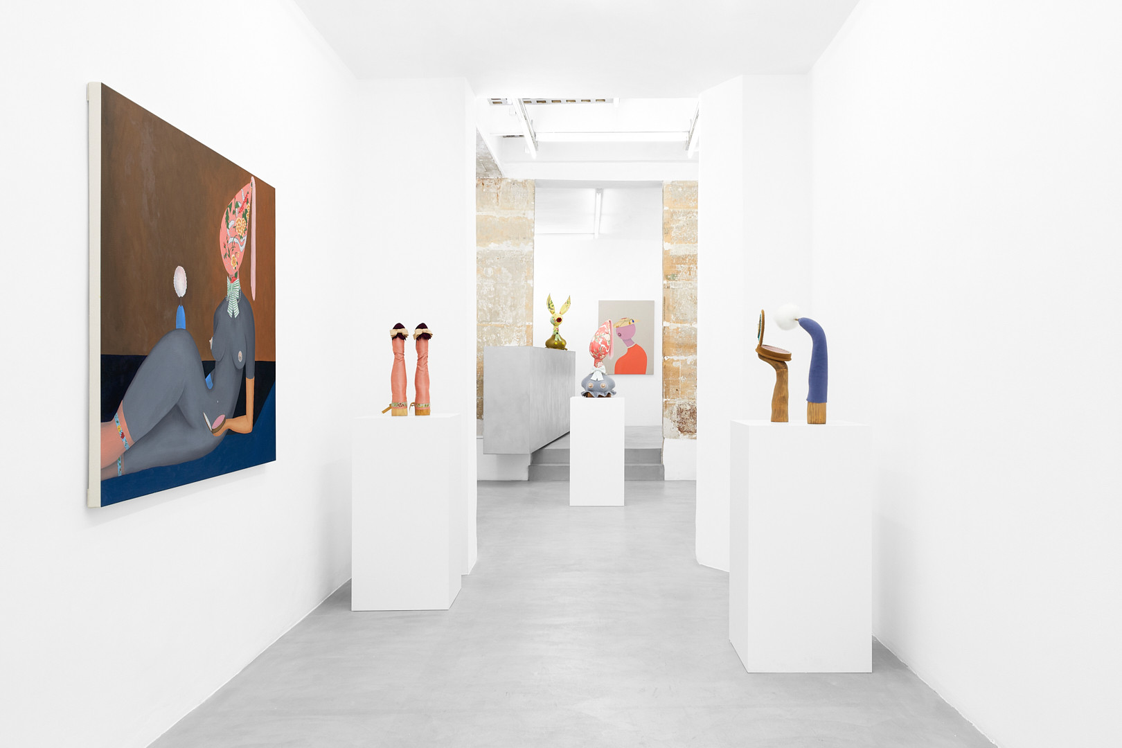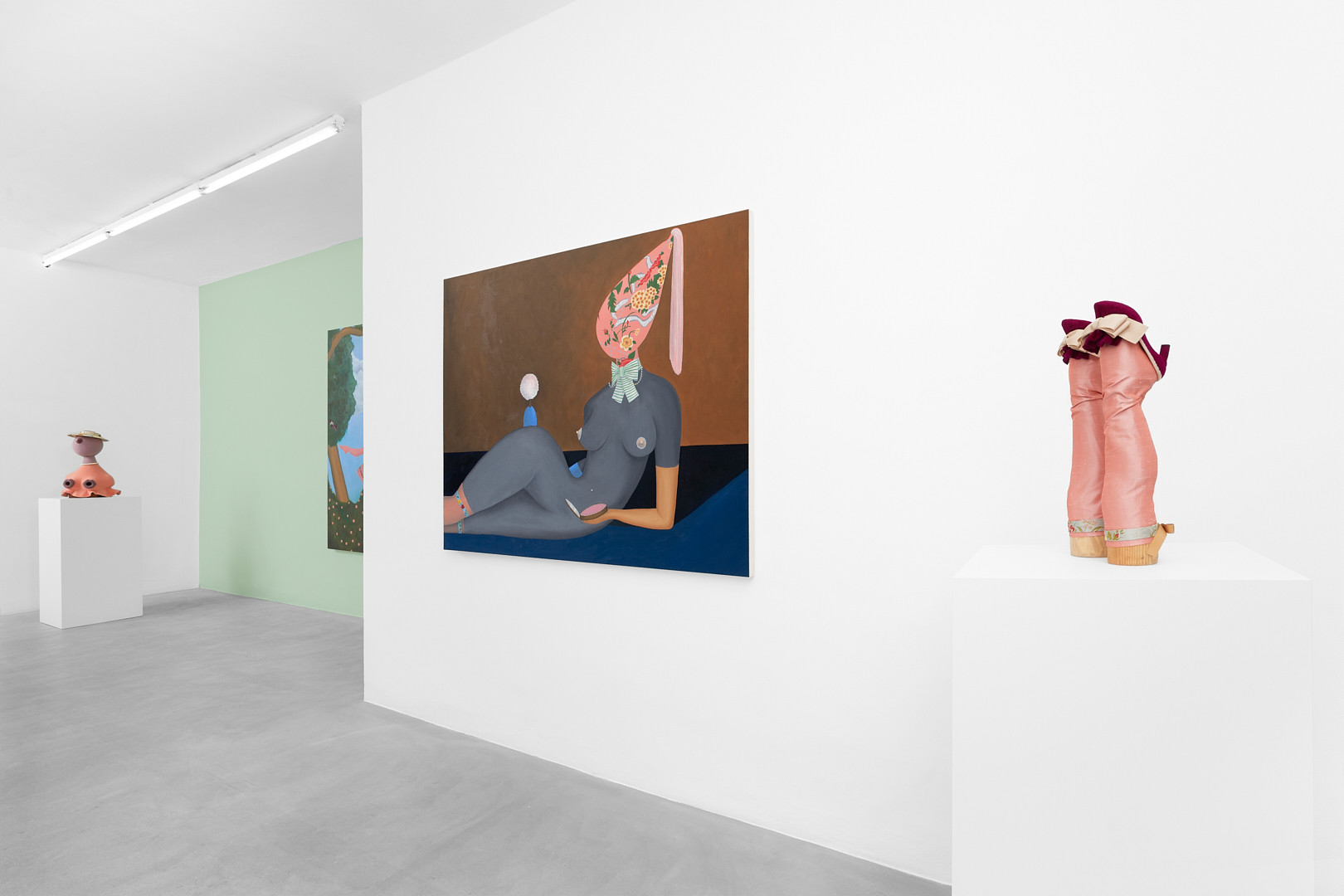 As Ryan Wilde explains, she wanted to stage “the American interpretation of French beauty, all in excess and humor.” The tone is casual, without pretention. Voluntarily girly and even silly. Just like the colors — from yellow to pink — or the wallpaper patterns. In these “mise-en-scene” of a masquerade, visions of innocence go along with coquetry. The cute costumes suddenly become protection. As for the parts of the woman’s body, they appear fragmented, enlarged or inverted. The mouth takes the place of the nipples, the breasts curl up in the palms of the hands. Only the eyes are absent, as if they were the only ones that the artist did not want to give us.