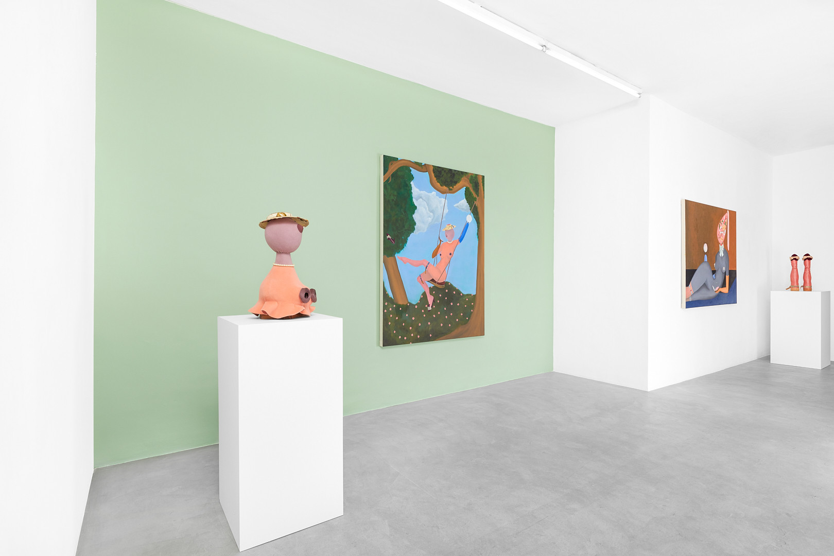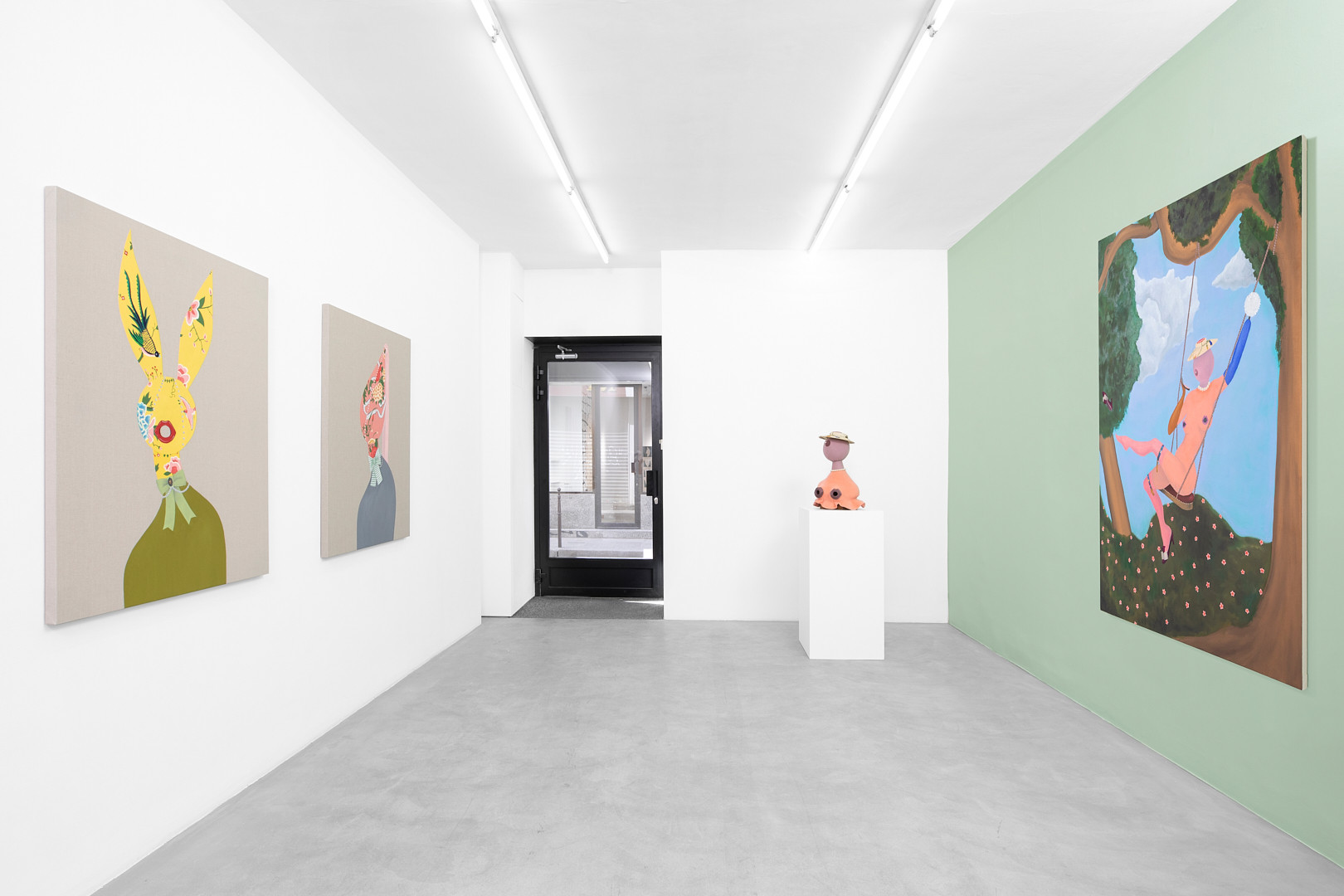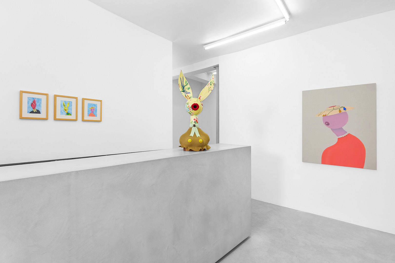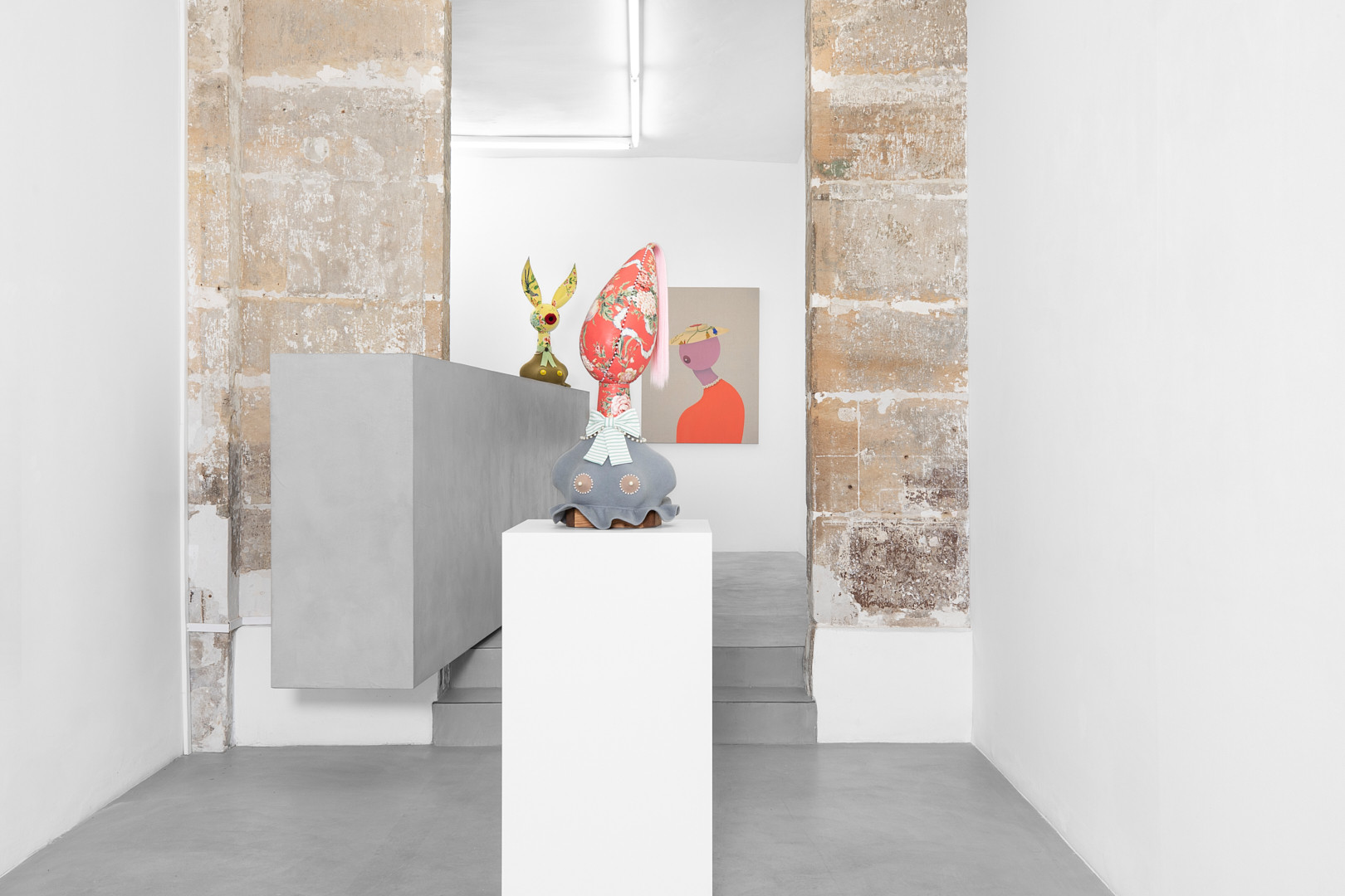As Ryan Wilde explains, she wanted to stage “the American interpretation of French beauty, all in excess and humor.” The tone is casual, without pretention. Voluntarily girly and even silly. Just like the colors — from yellow to pink — or the wallpaper patterns. In these “mise-en-scene” of a masquerade, visions of innocence go along with coquetry. The cute costumes suddenly become protection. As for the parts of the woman’s body, they appear fragmented, enlarged or inverted. The mouth takes the place of the nipples, the breasts curl up in the palms of the hands. Only the eyes are absent, as if they were the only ones that the artist did not want to give us.