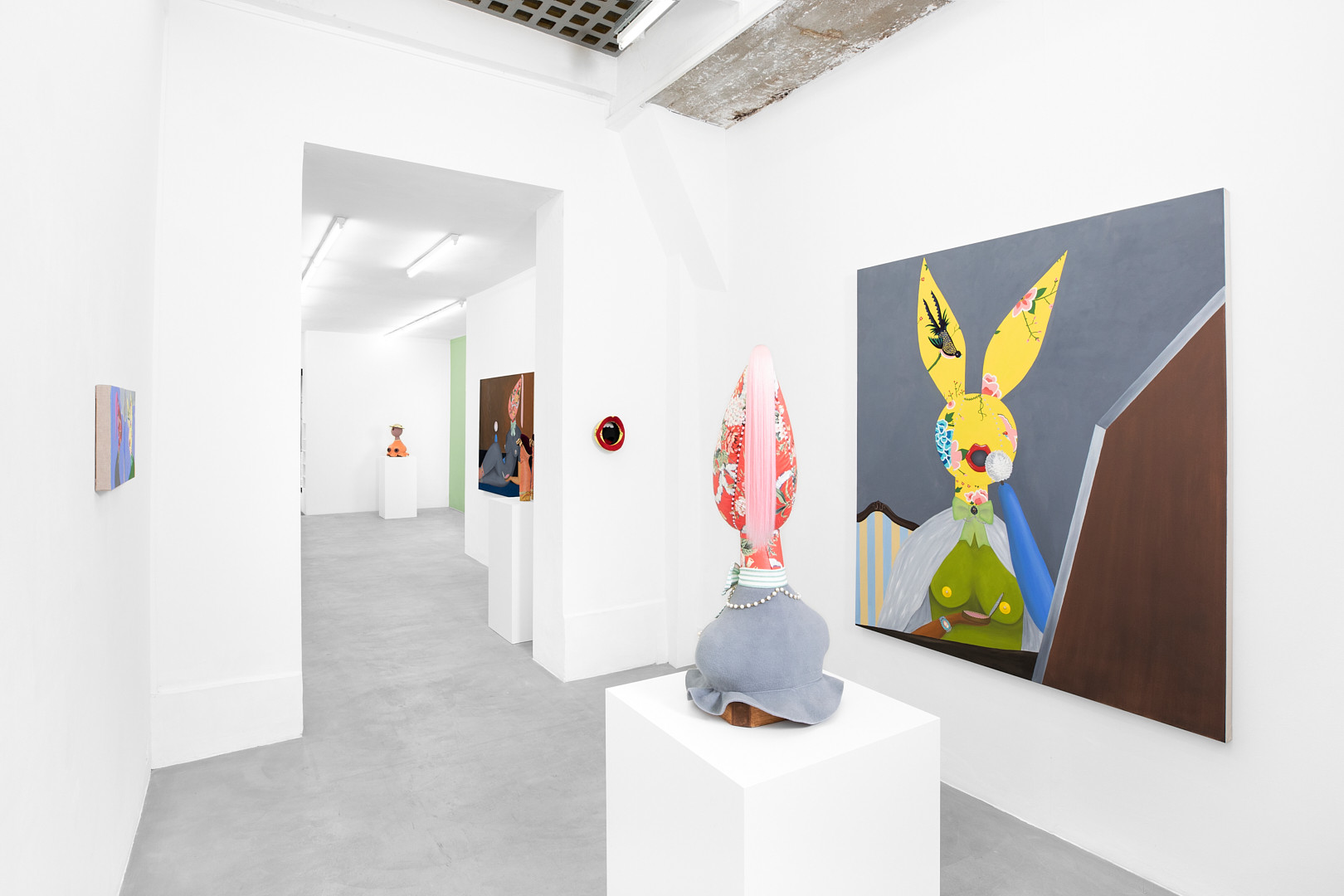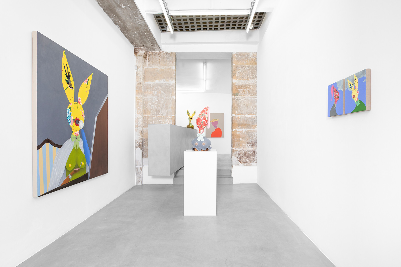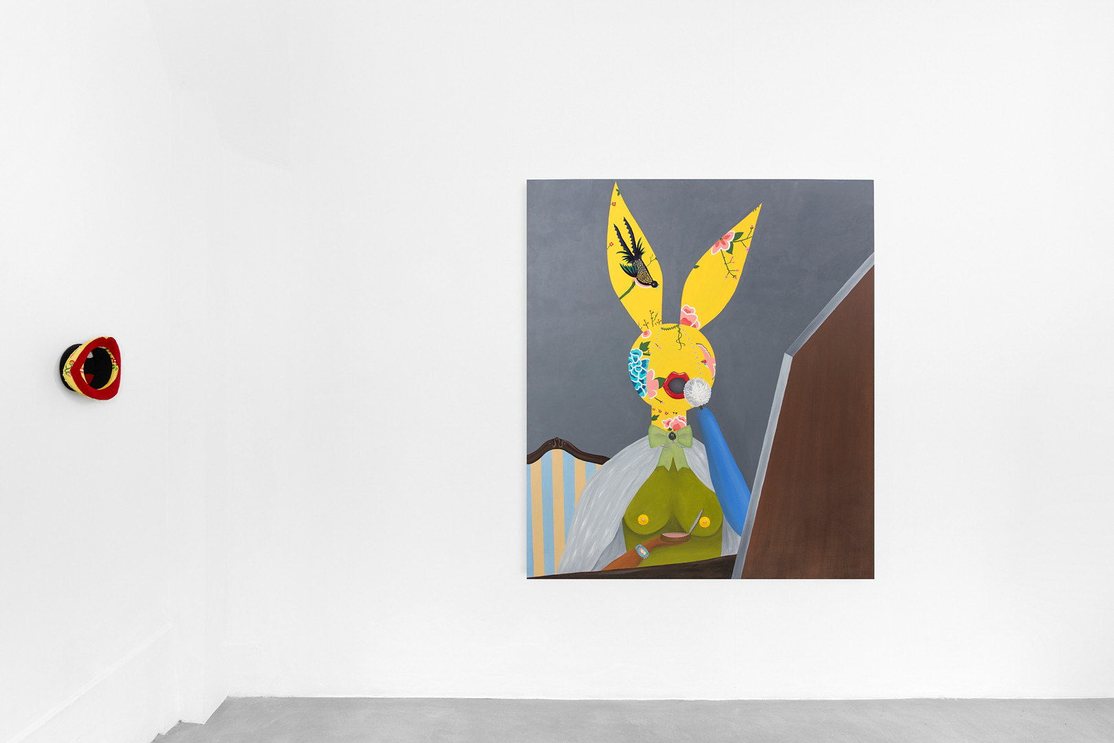 La Lapine frees herself from the Playboy Playmate — a magazine for which Ryan Wilde’s father worked for twenty years as an illustrator and for which the artist feels a kind of love-hate relationship: hate for this temple of female imagery modeled and normalized by the male gaze, love for the possible reversals made in Playboy to the point where Wilde even drew the rabbit ears worn by Kate Moss on the cover.