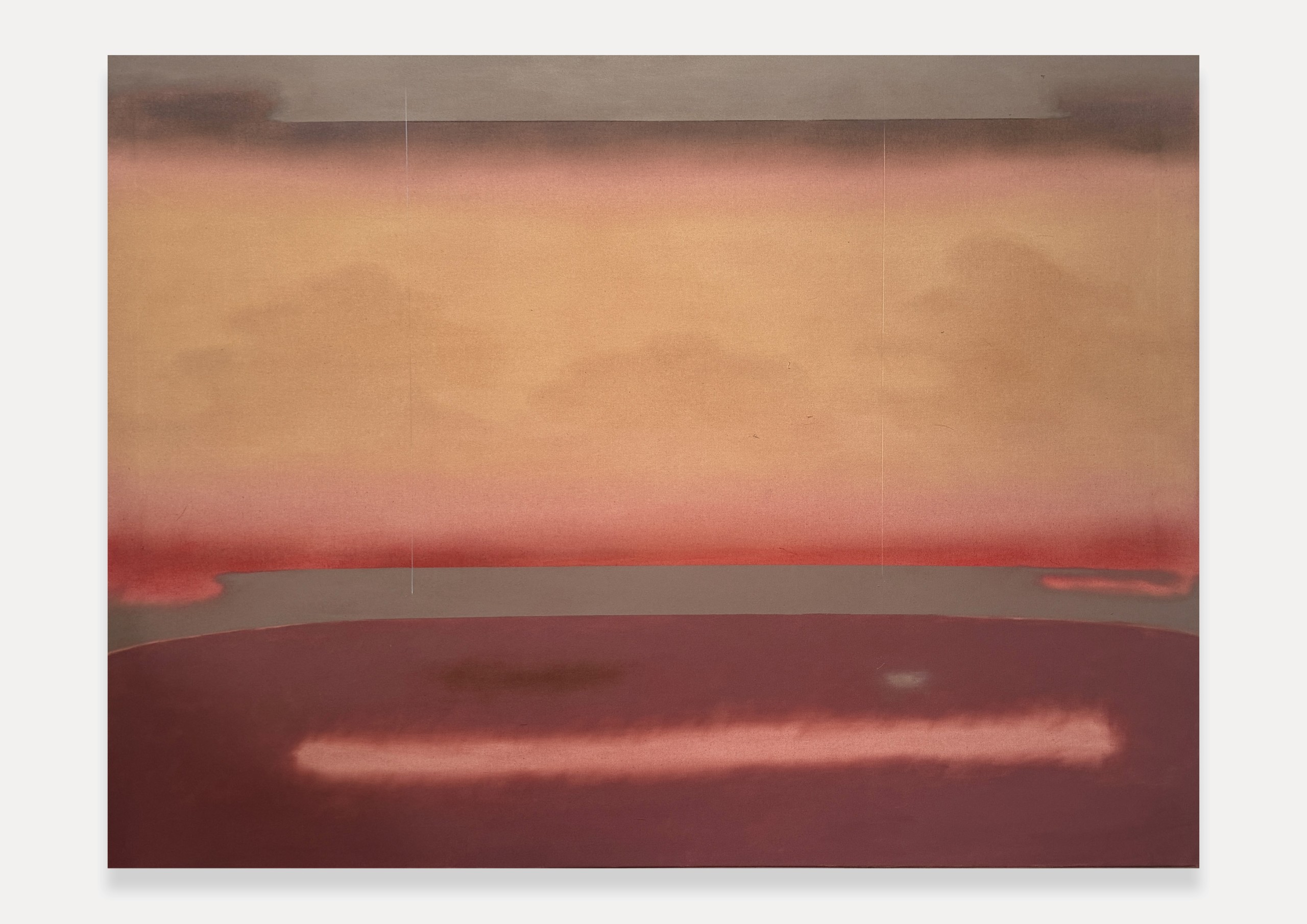 Light plays a central role in this body of work, not as a rupture but as an extension of this chromatic exploration. It operates as a structuring force that modulates how color behaves, how depth is suggested, and how space unfolds across the surface. Shadows, dusk-like tones, and subtle shifts in luminosity guide the viewer’s eye, shaping the atmospheric conditions of each painting rather than describing a specific time or place.